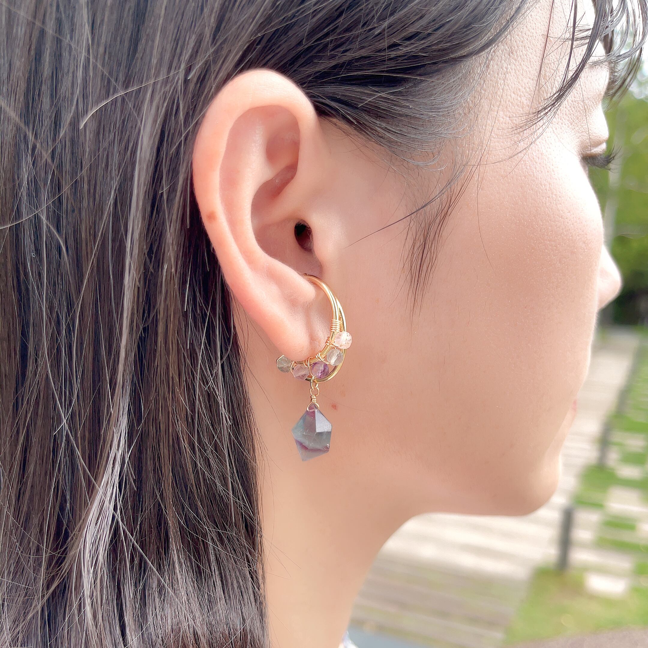 耳たぶを覆うように装着する少し大きめの土台に2種類の形の天然石を設置し、