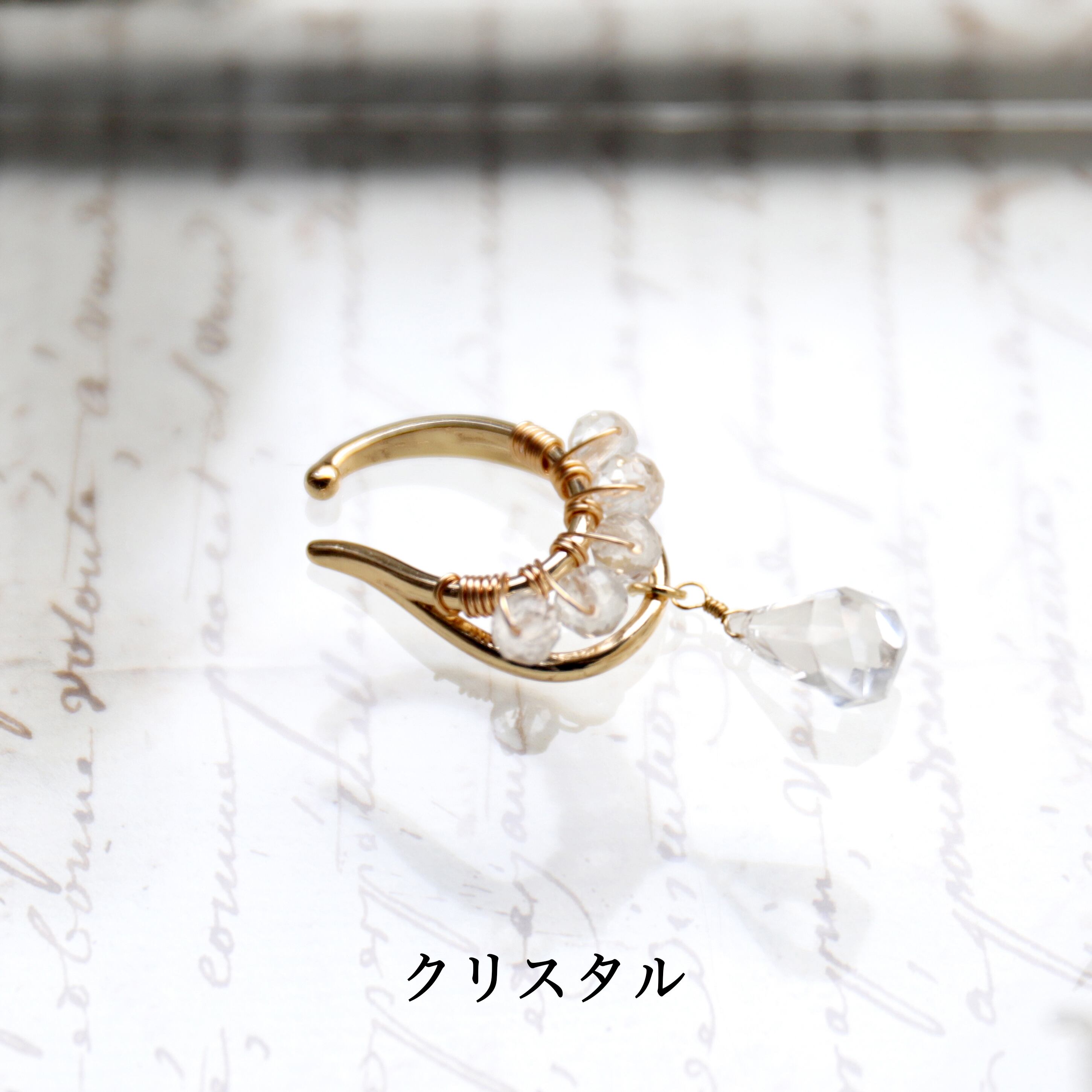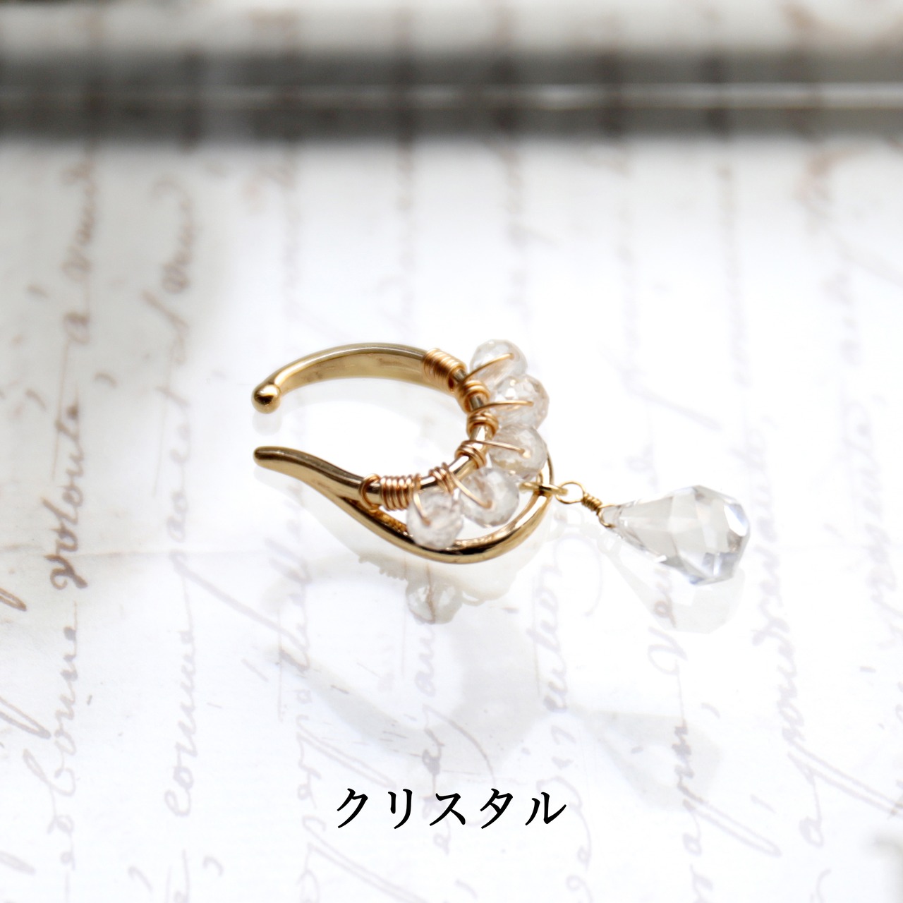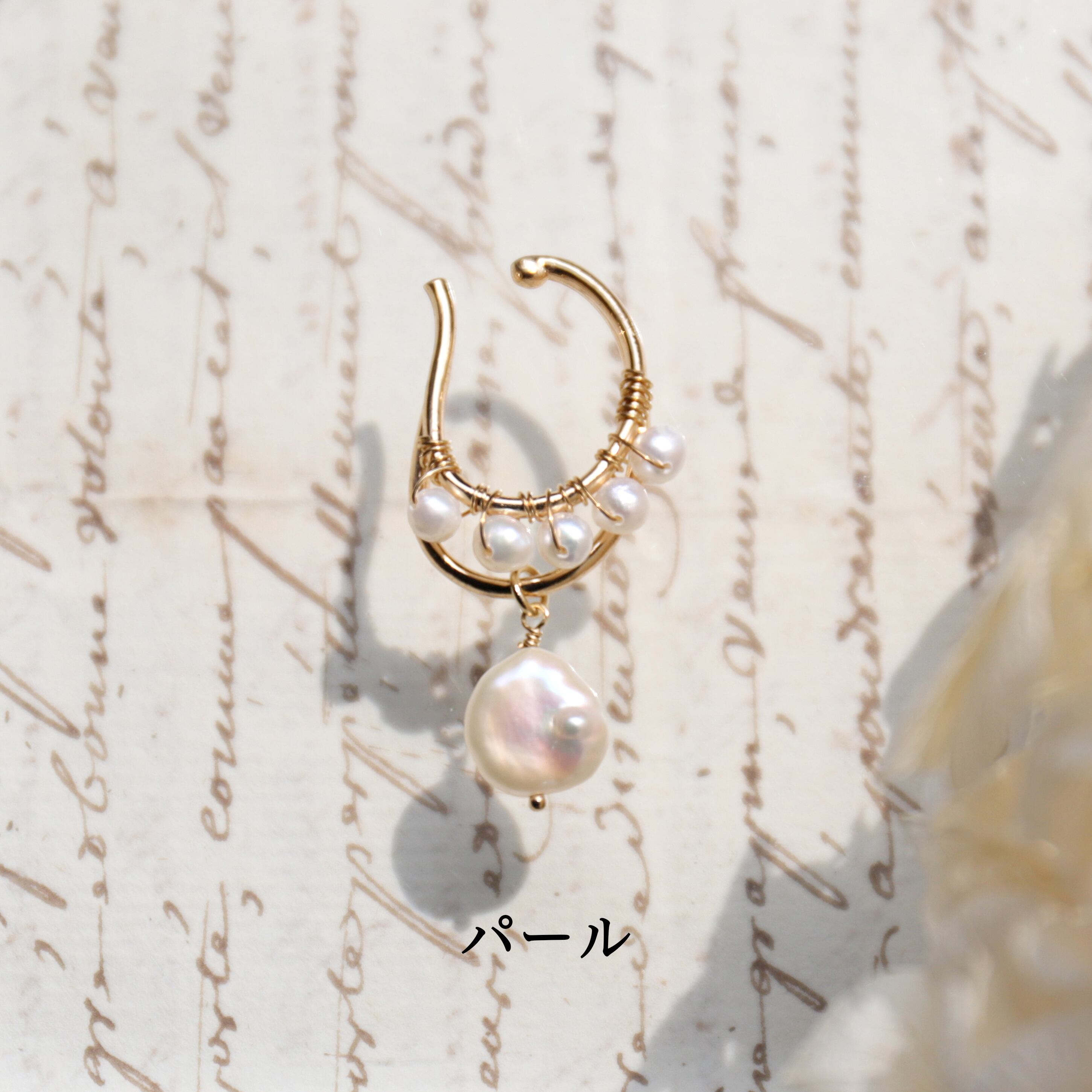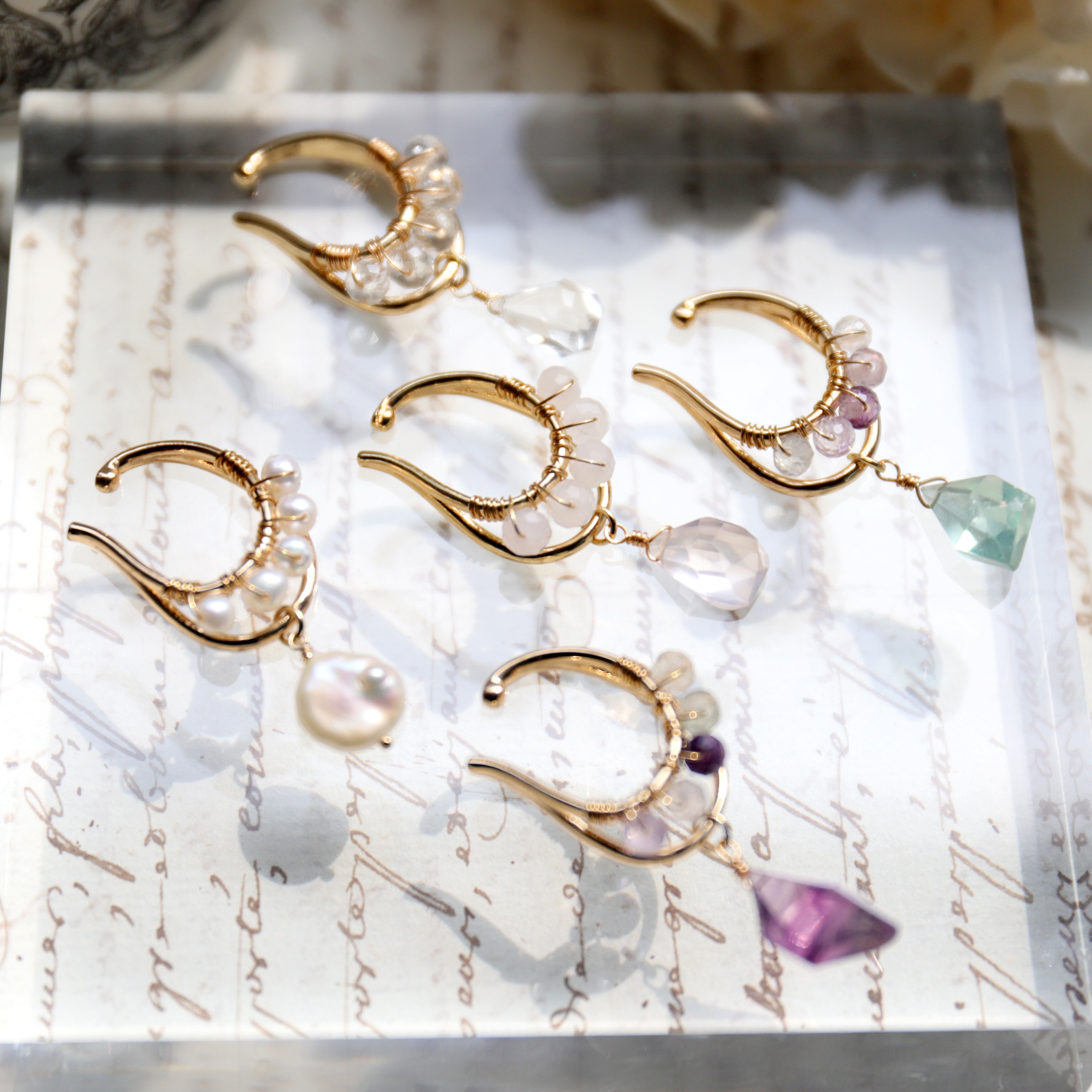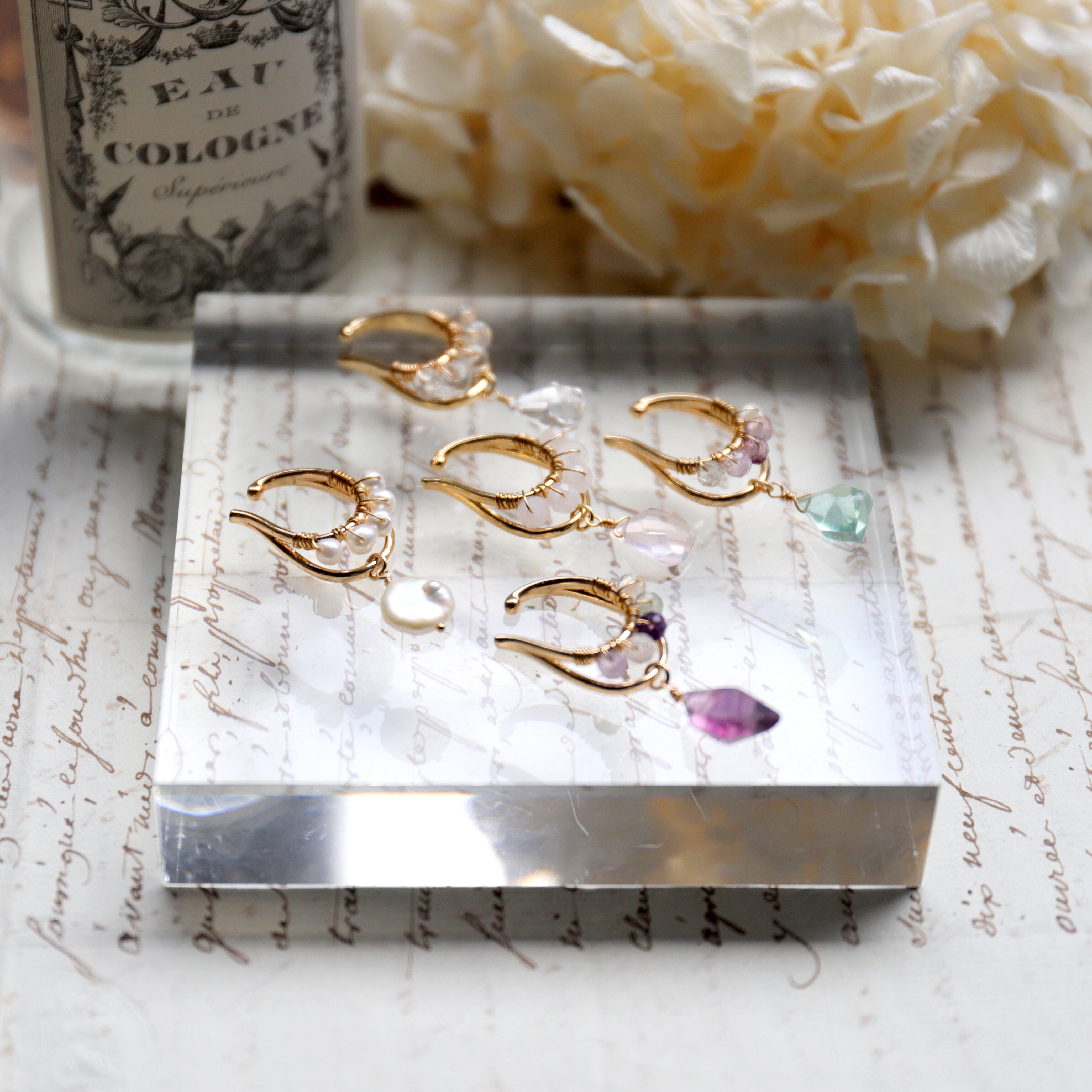 上部には4mmのパールやラウンドカットの天然石5粒をワイヤーで固定して、