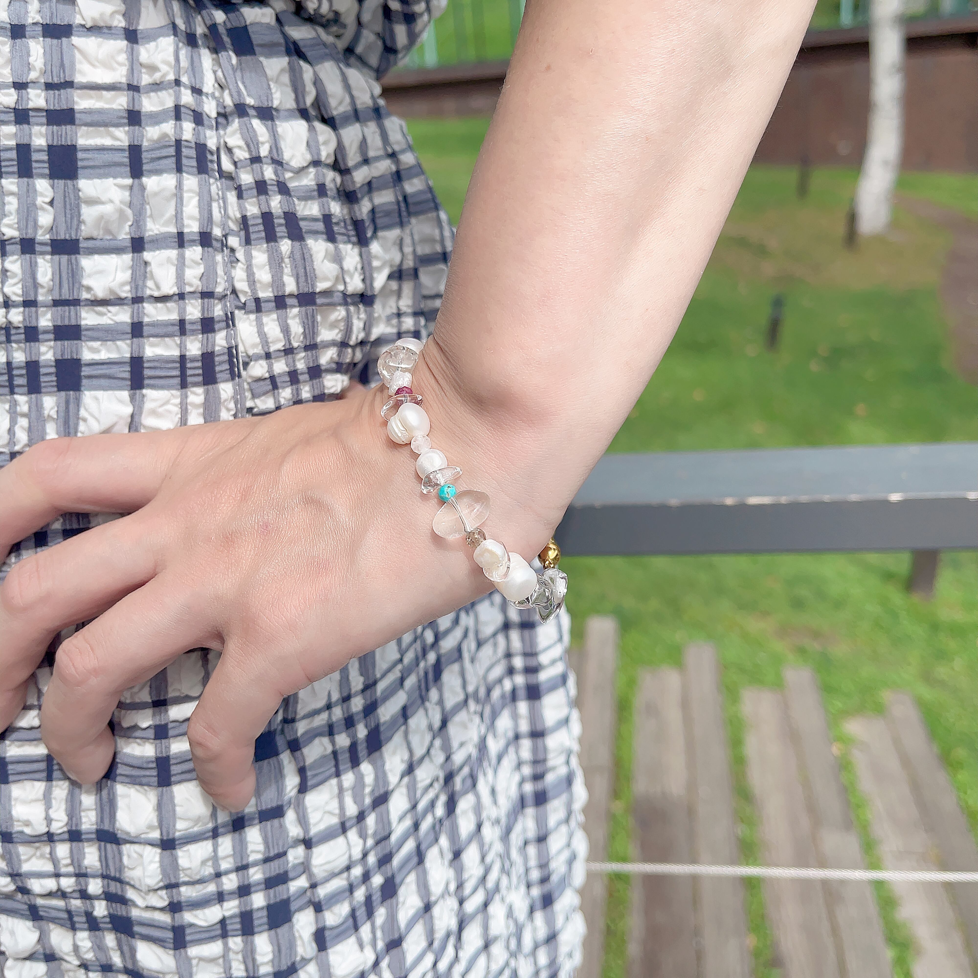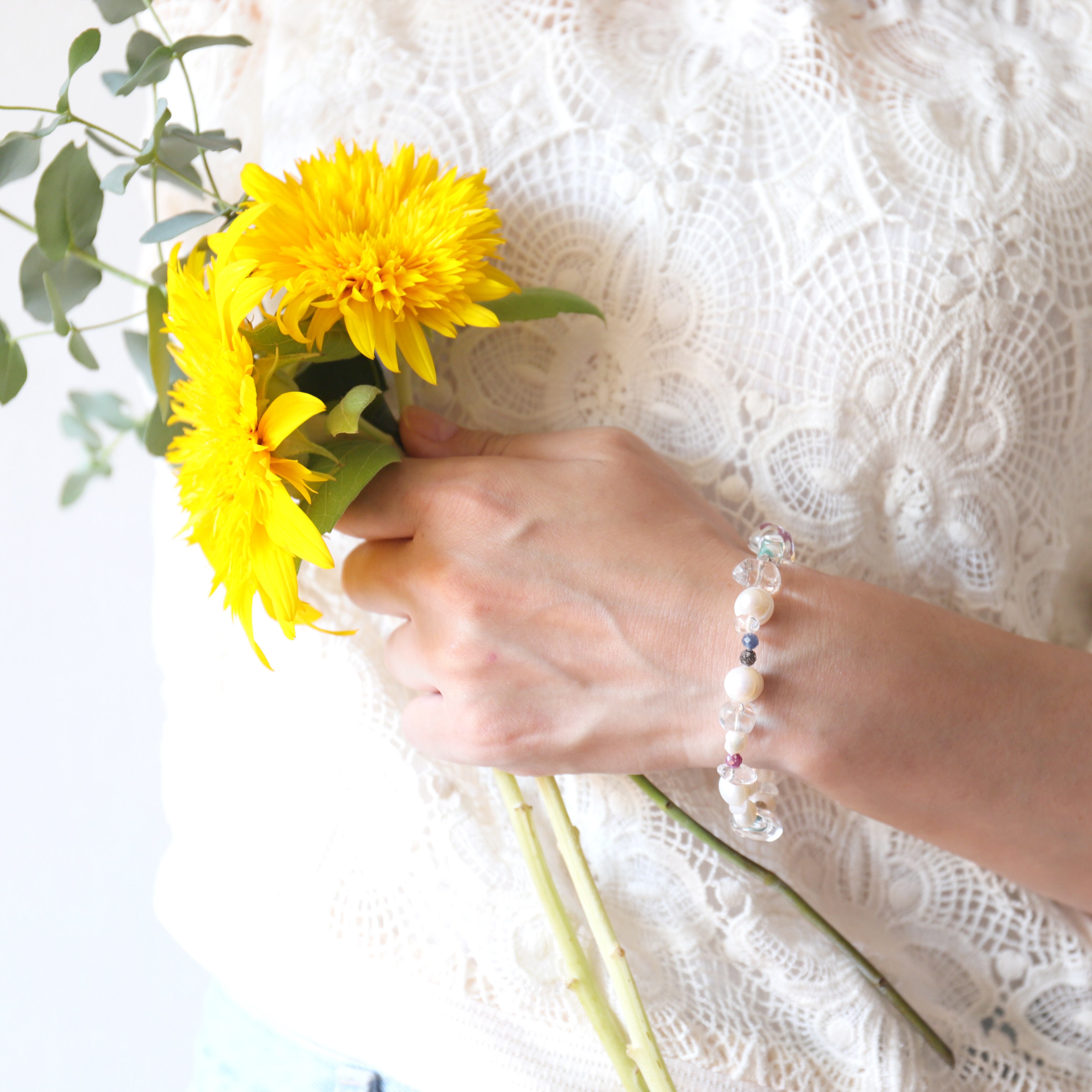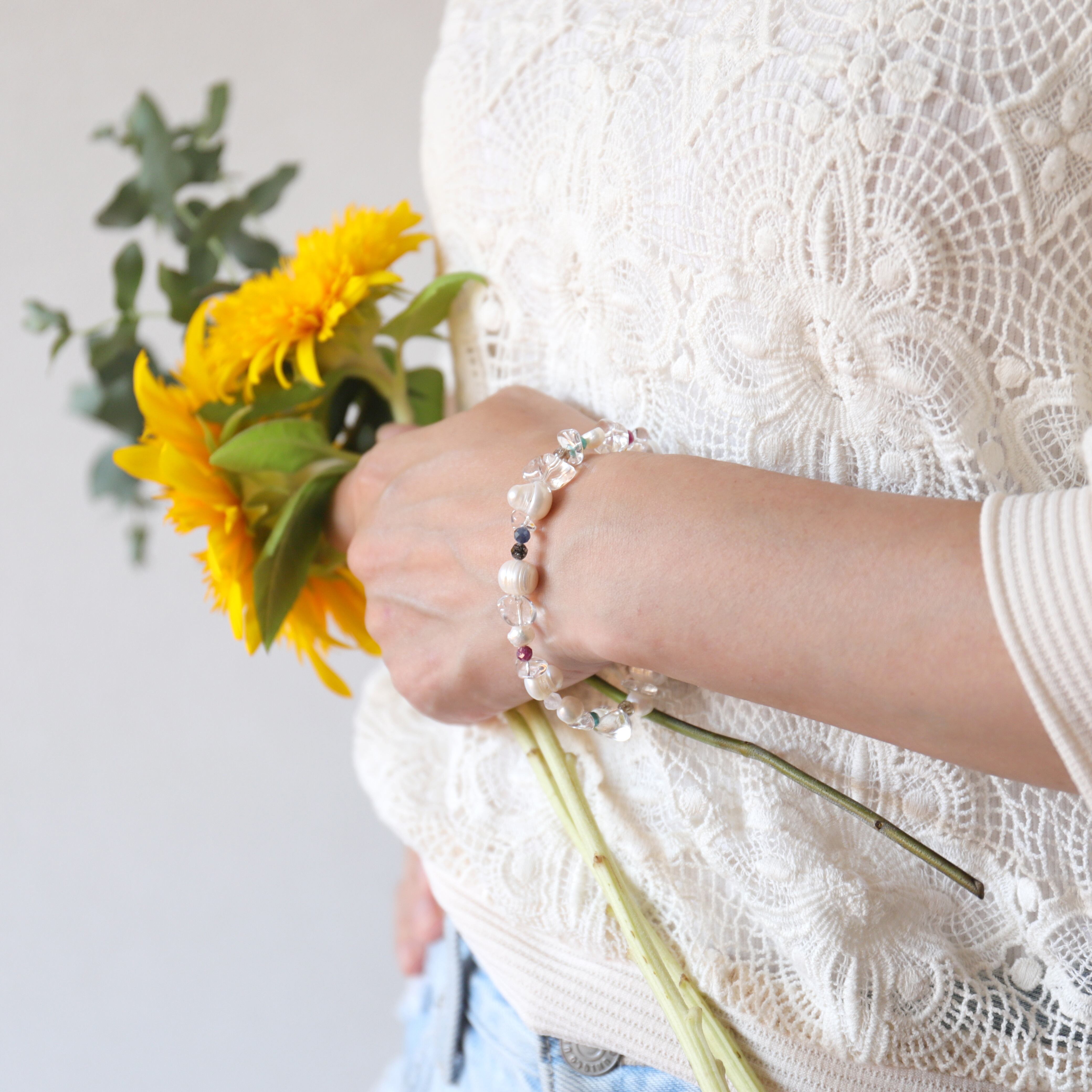 大きめの淡水パールやクリスタルをメインに、