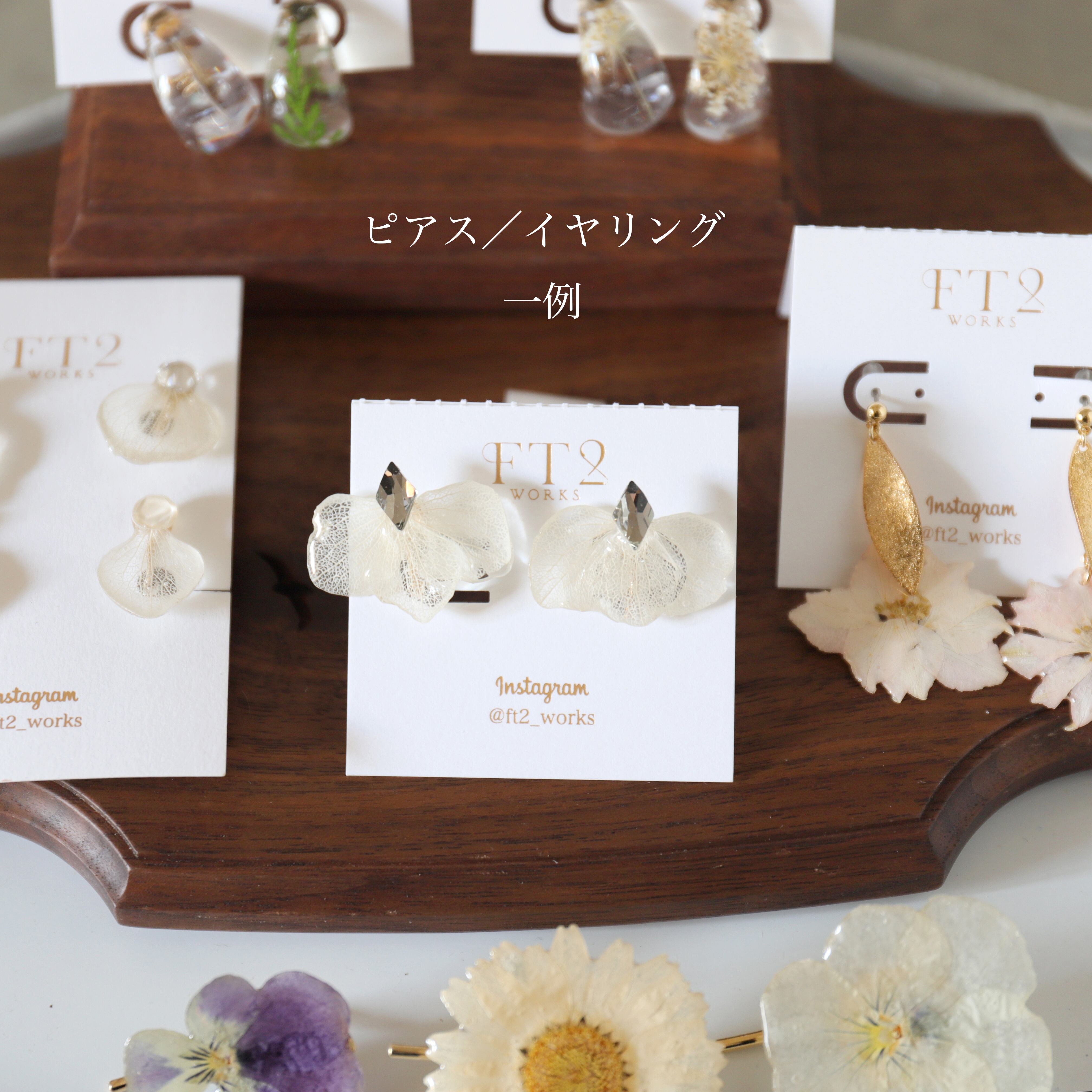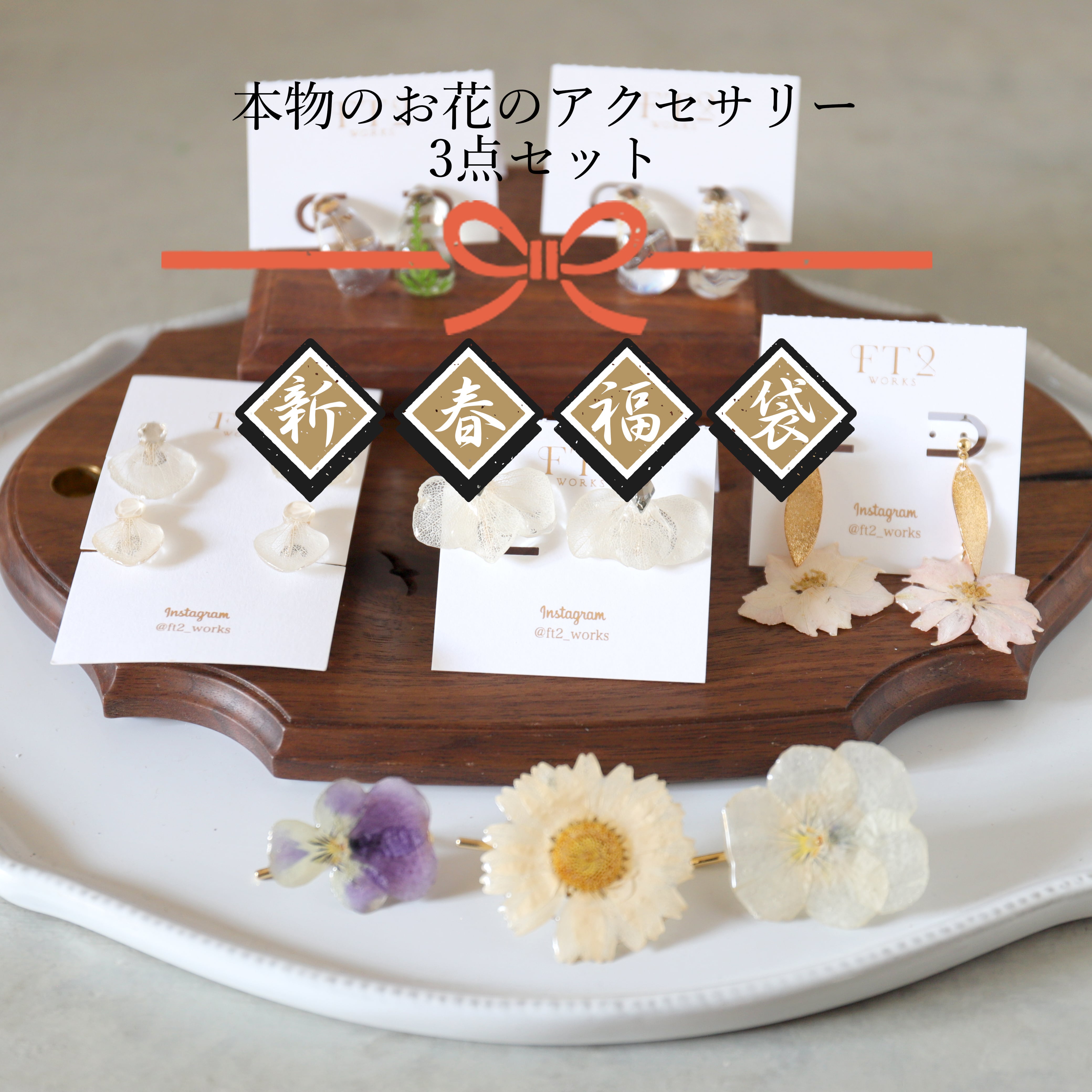 ①本物のお花のアクセサリー3点セット(イヤーアクセ2点+ポニーフック1点)