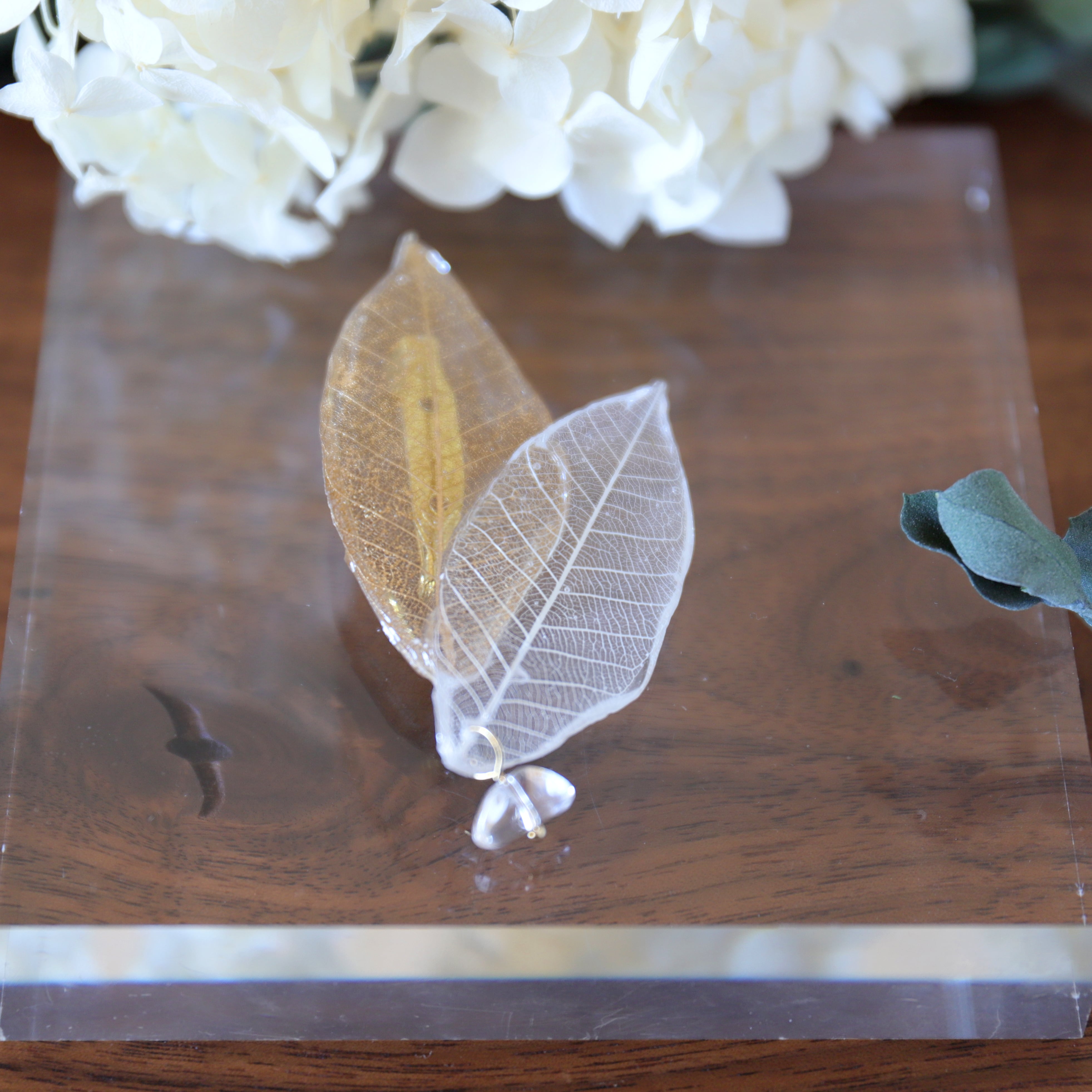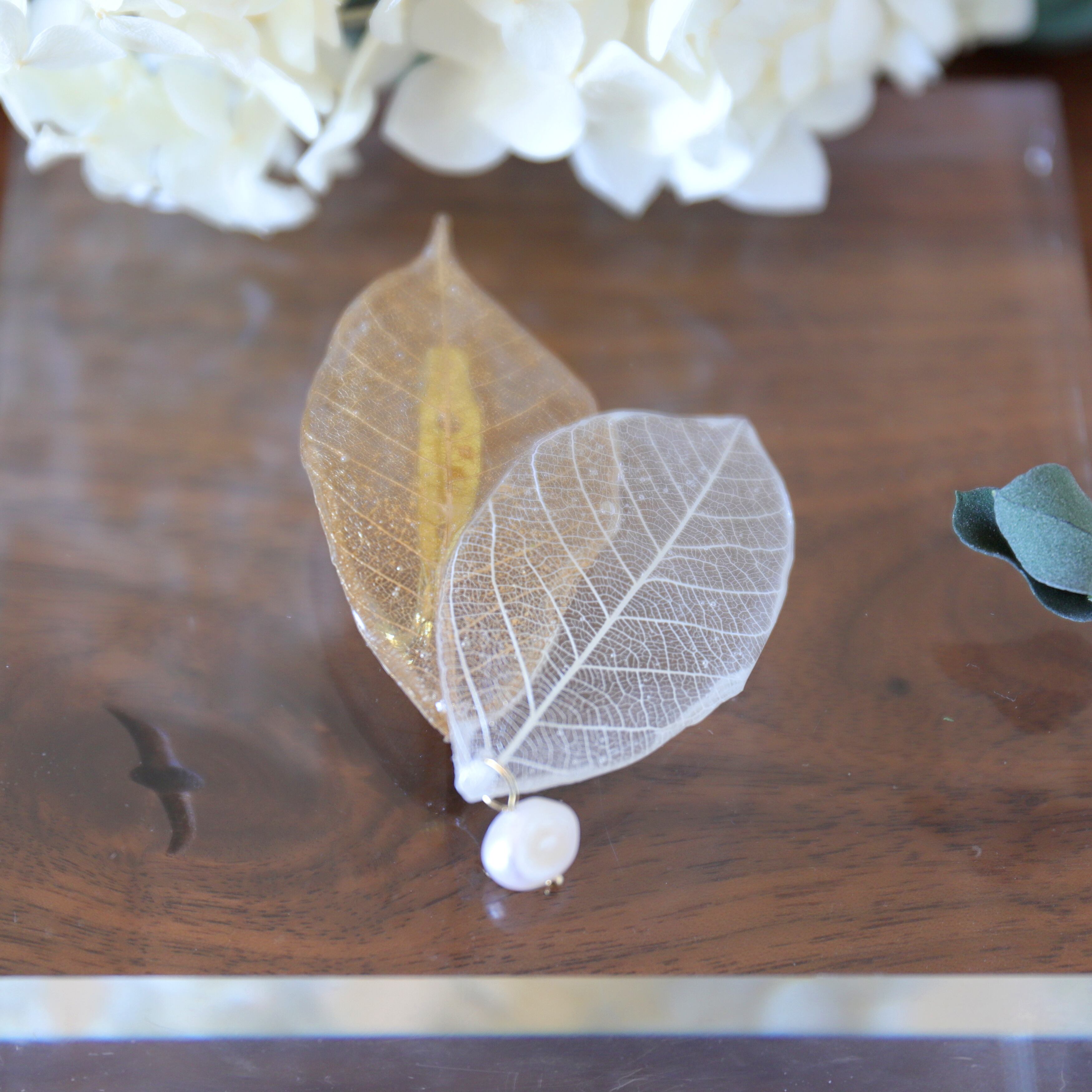 本物のパラゴムのリーフと淡水パール/クリスタルを合わせた