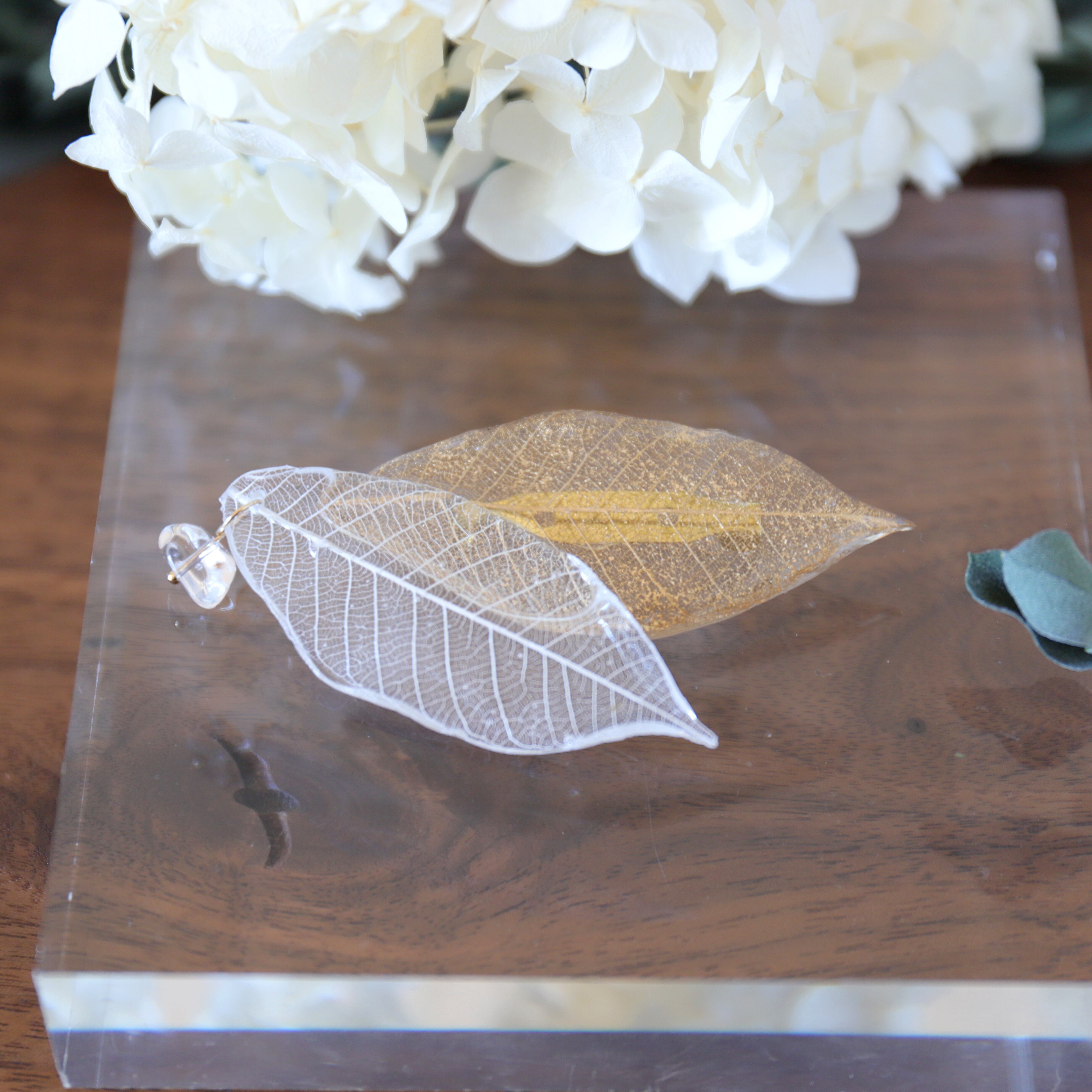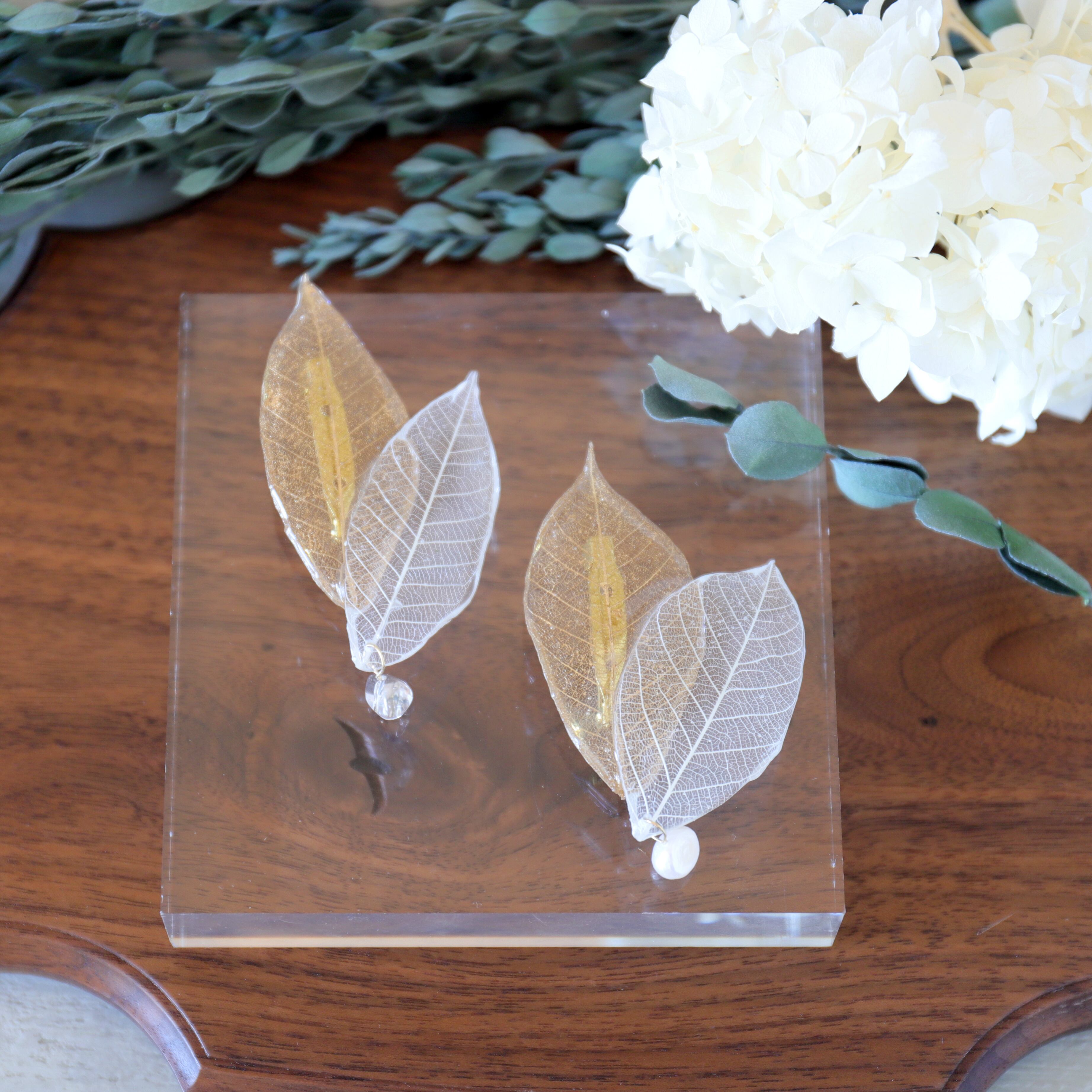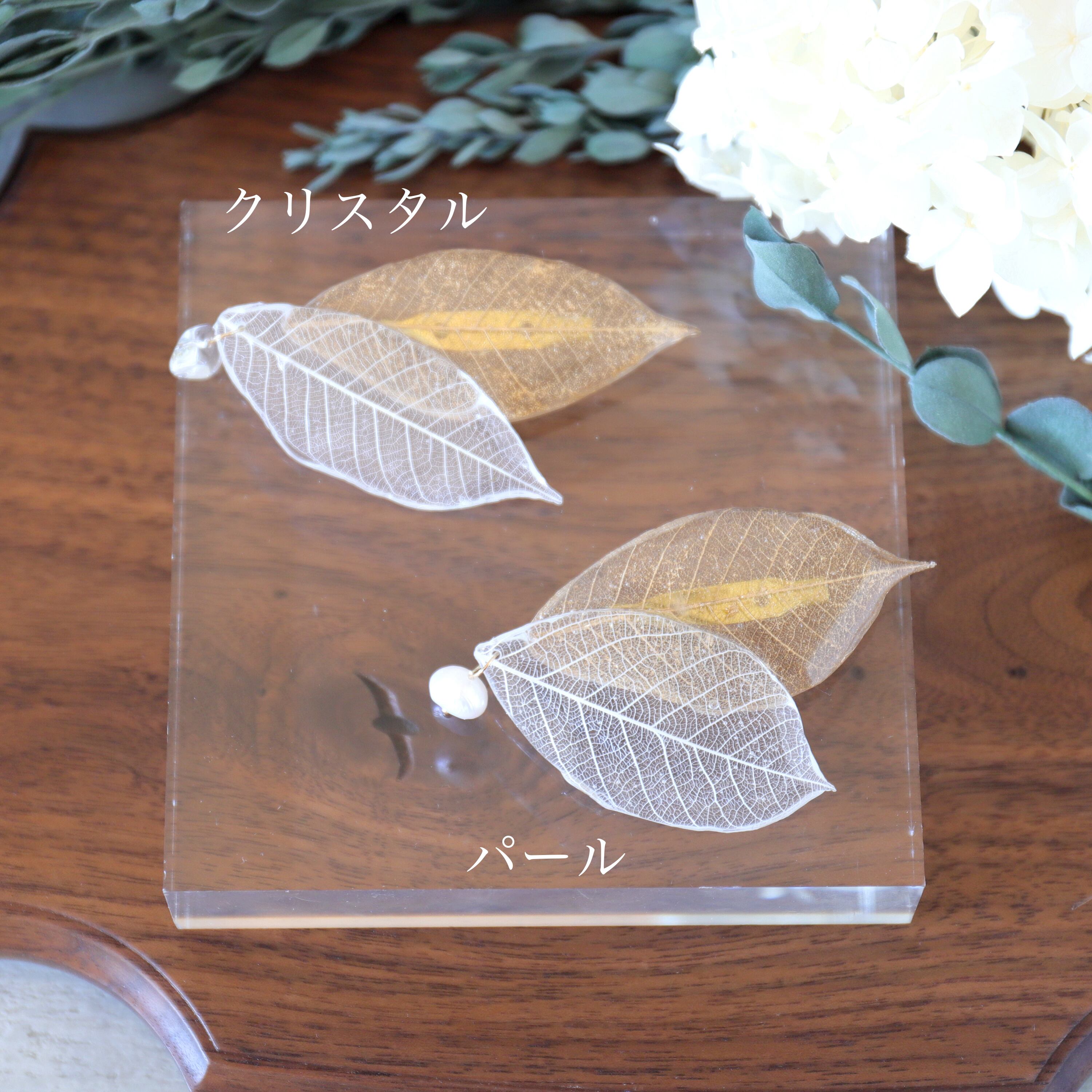 またホワイトリーフの先には大ぶりの淡水パール/クリスタルを合わせ