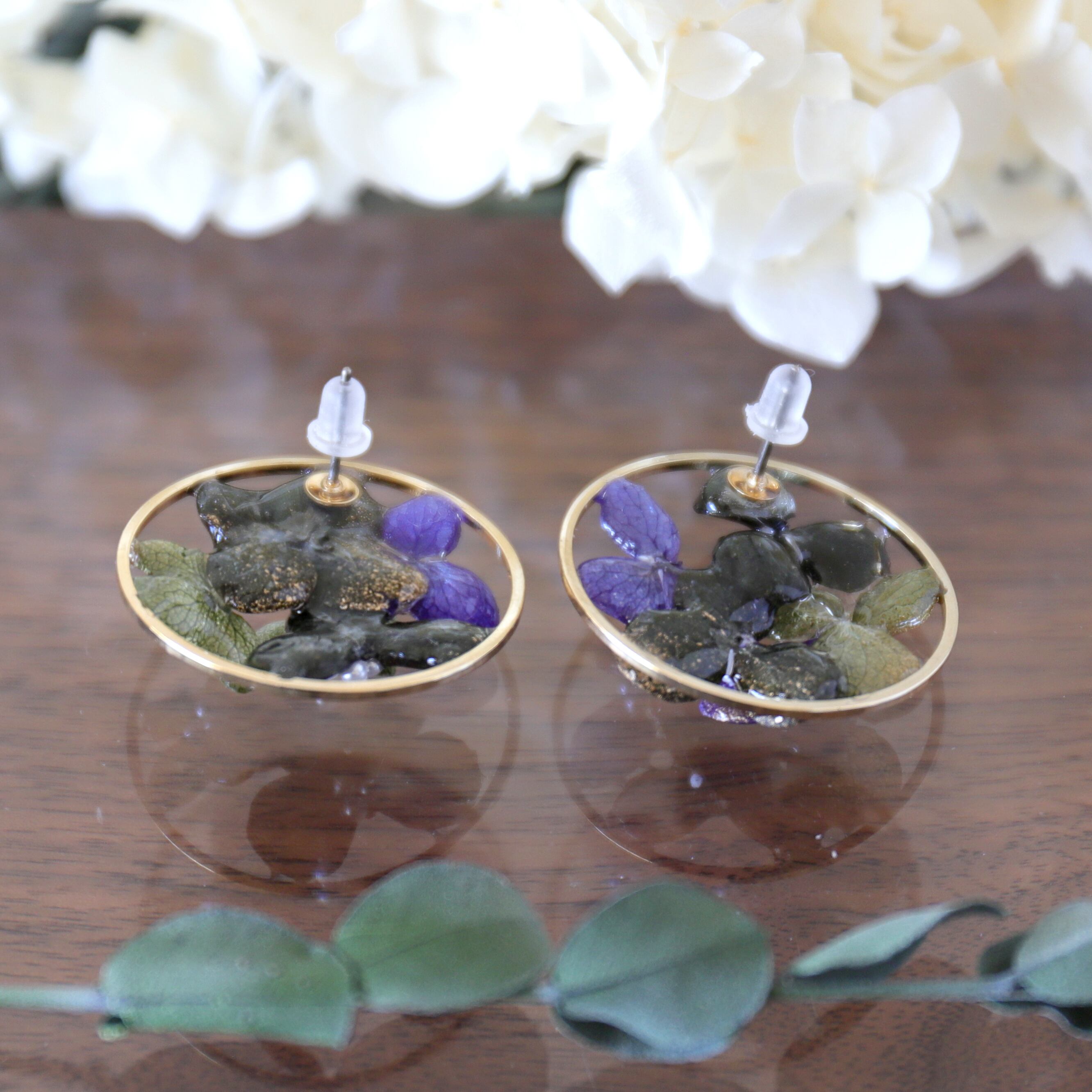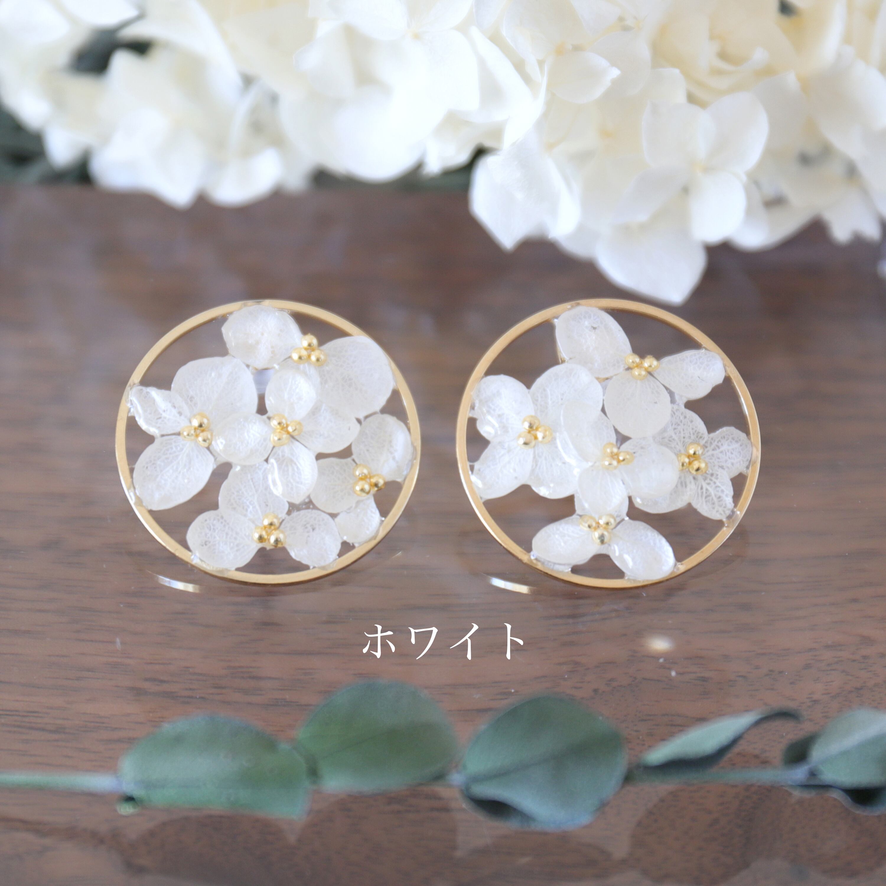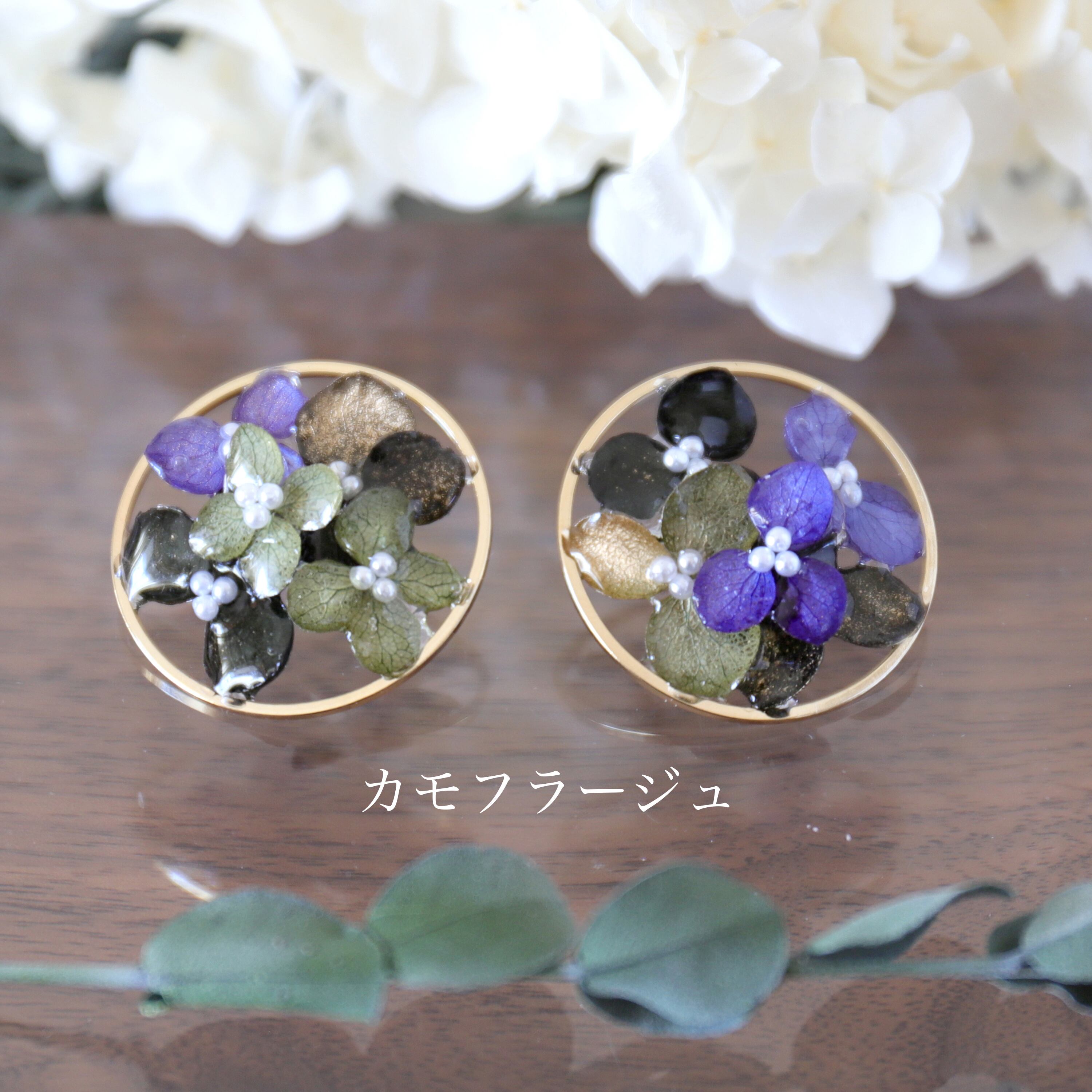 30mmのラウンドゴールドのパーツの内側にアジサイを配置し