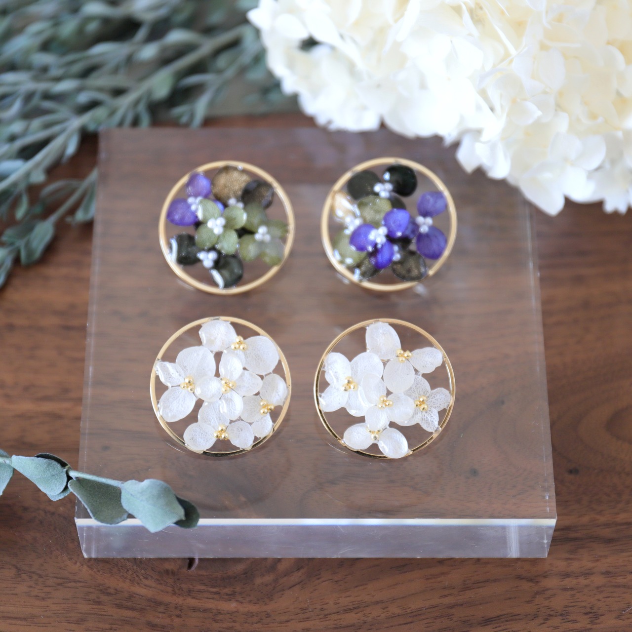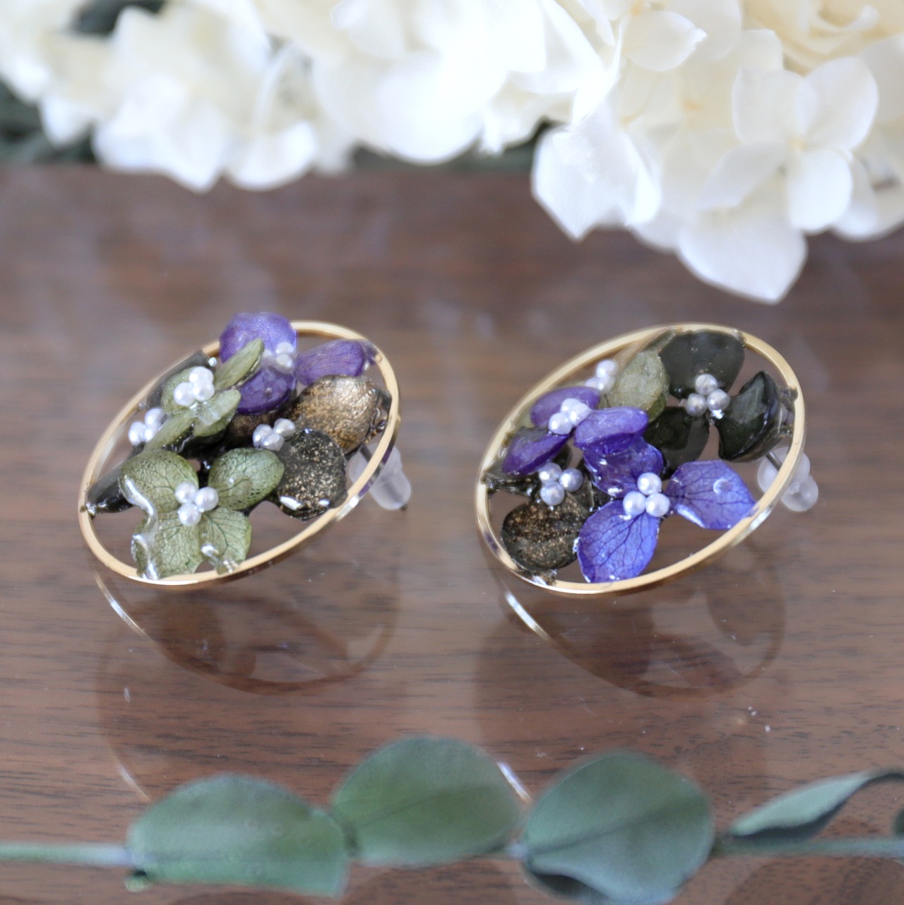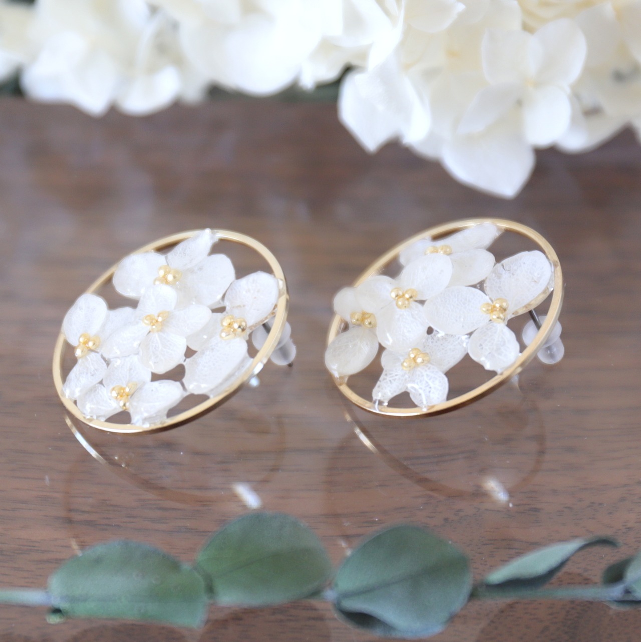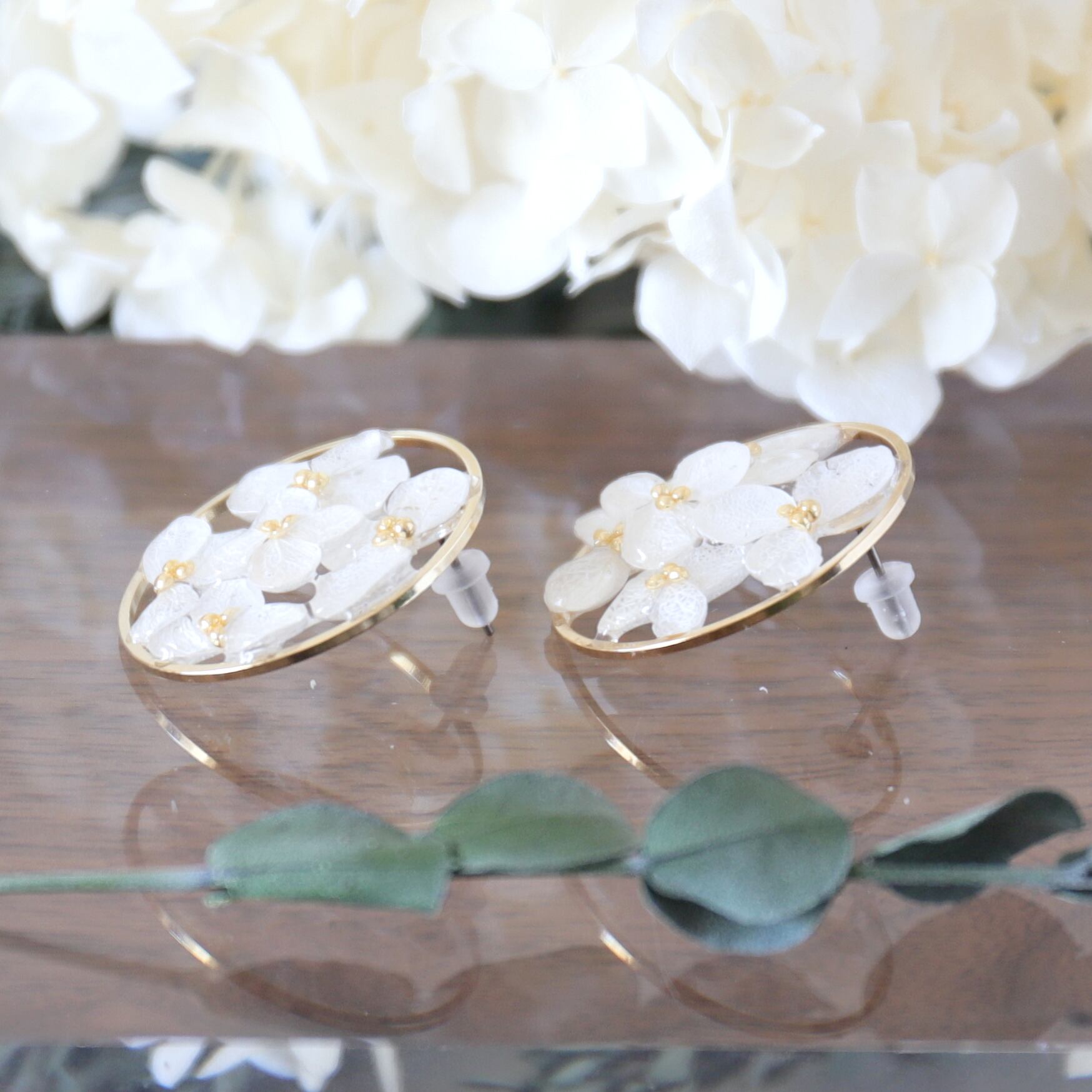 30mmのラウンドゴールドのパーツの内側にアジサイを配置し