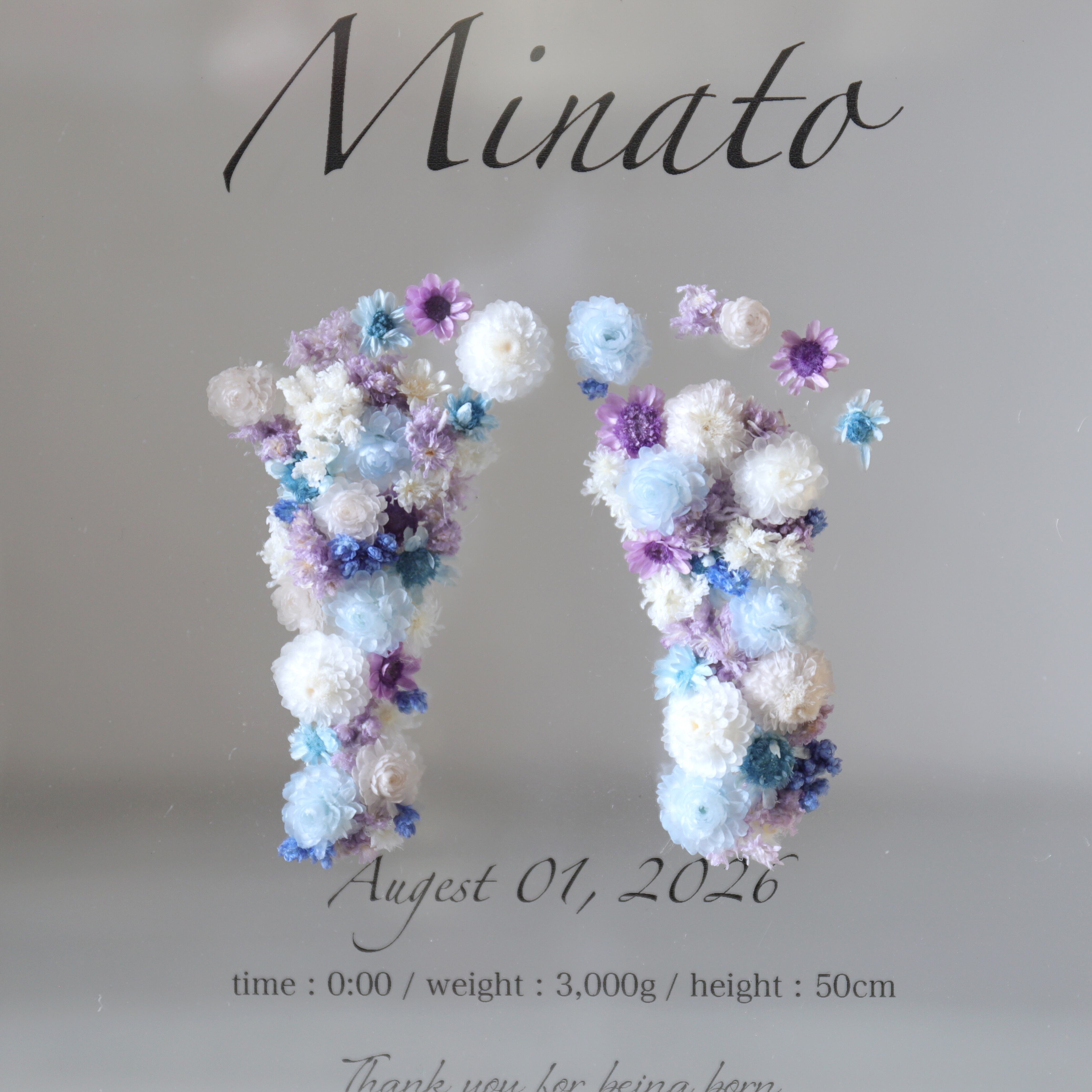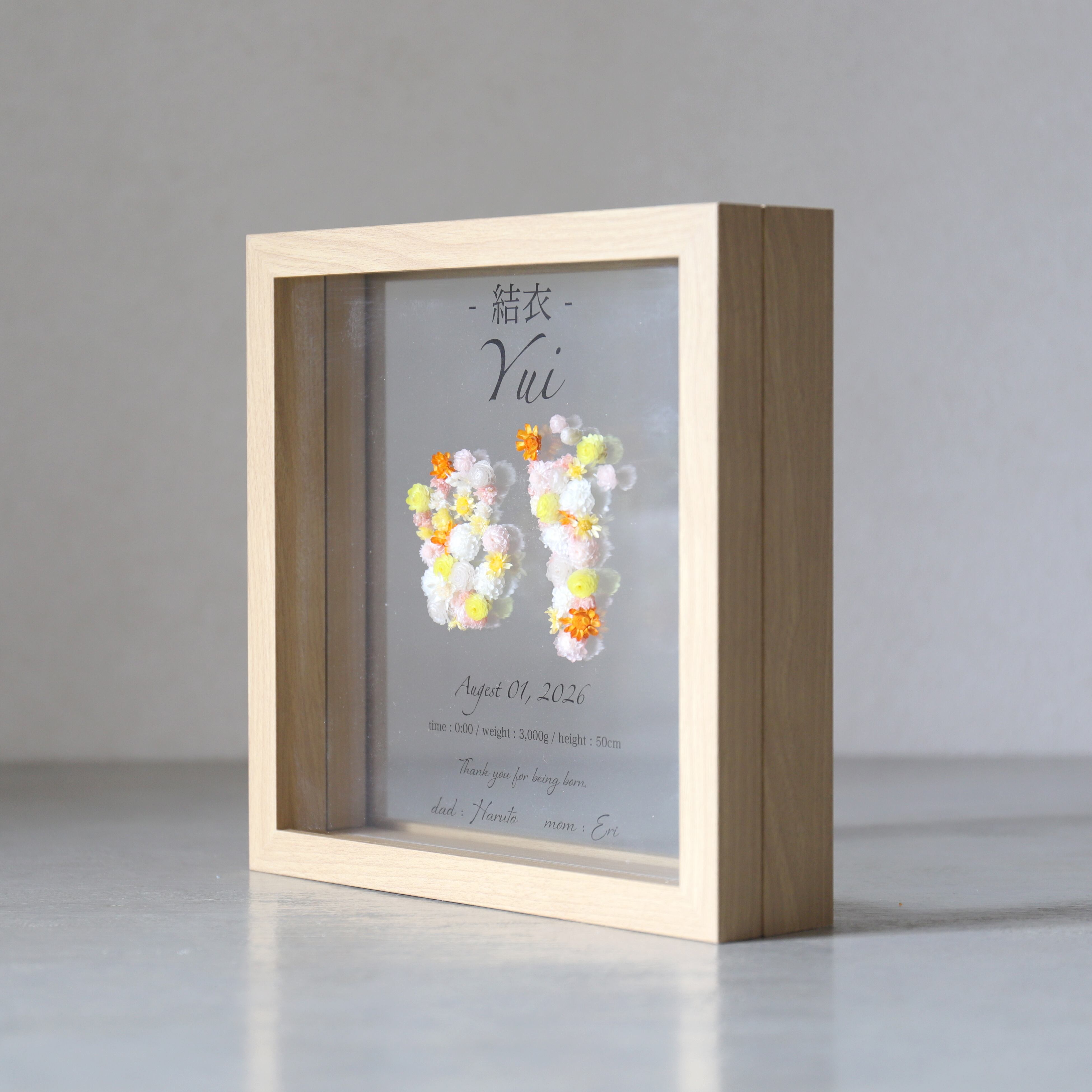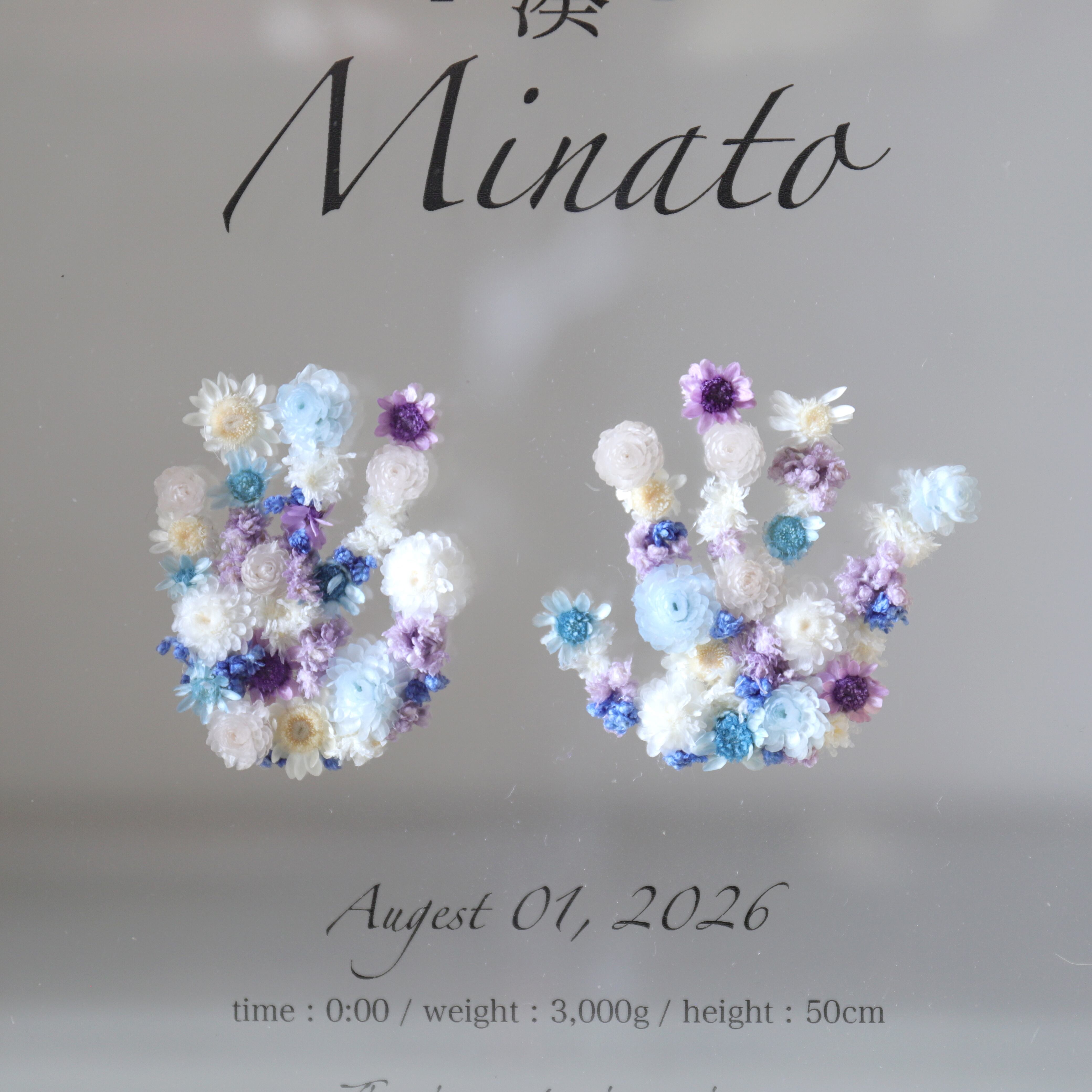 重厚感のあるガラスフレームに新生児期の貴重な手型・足型を
