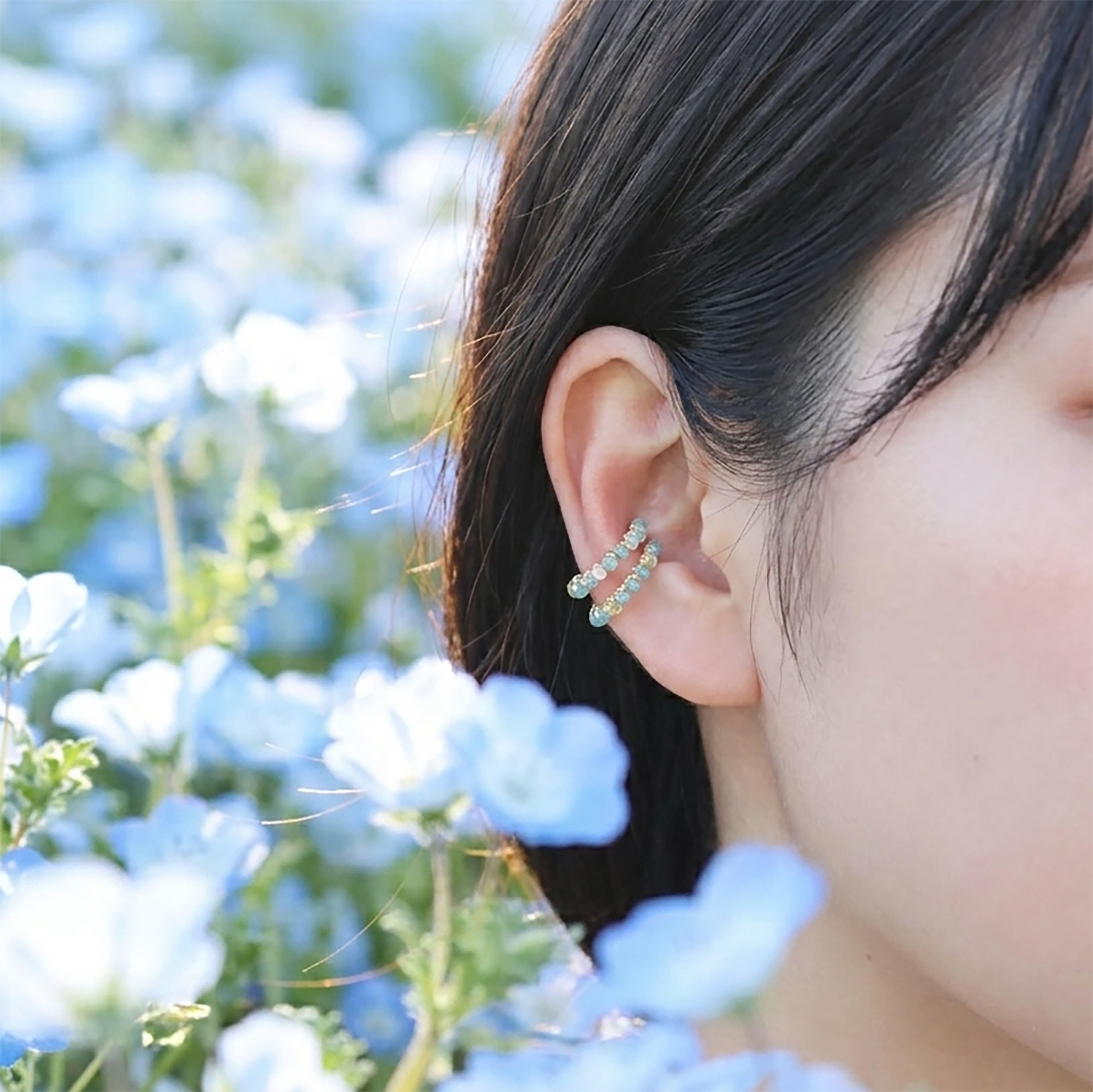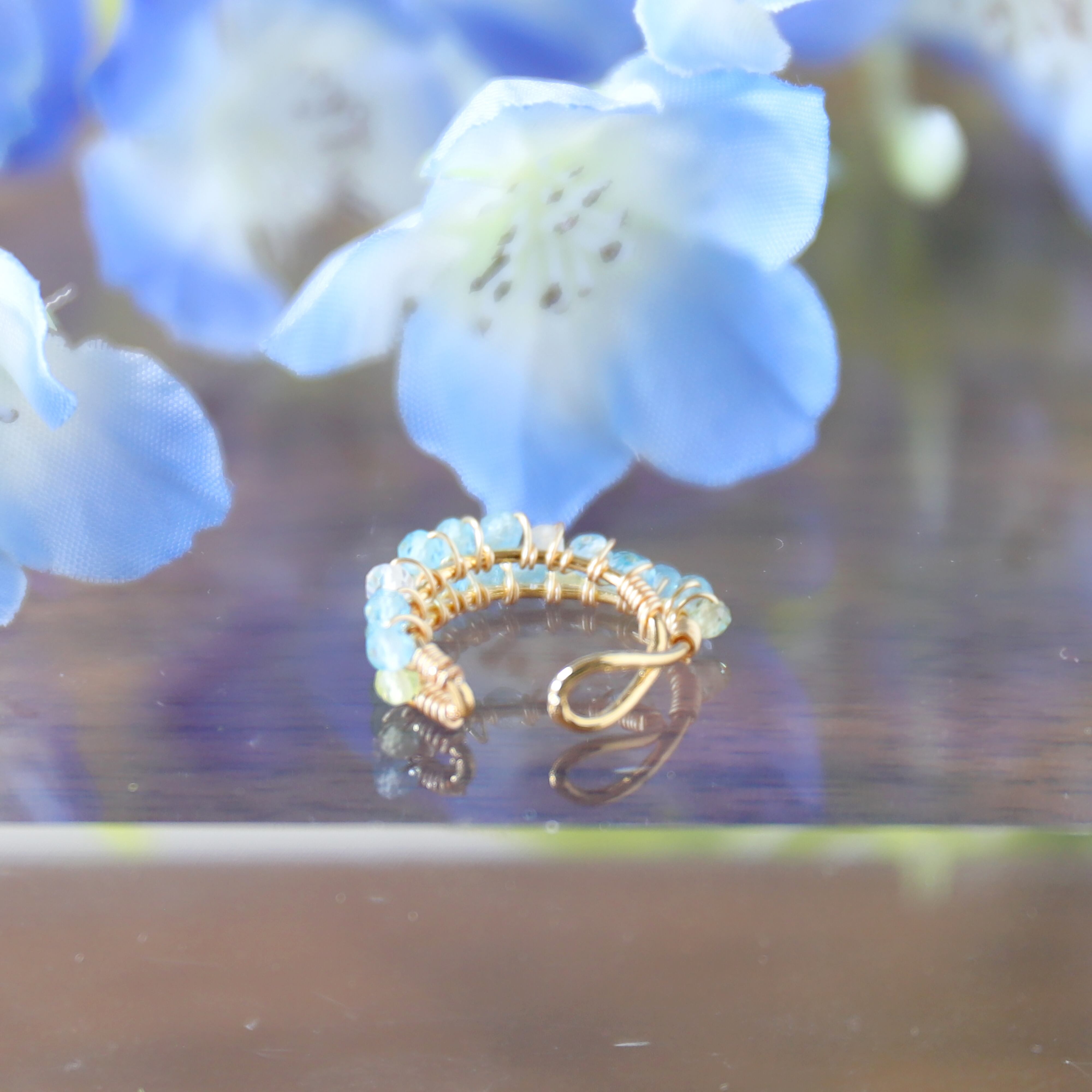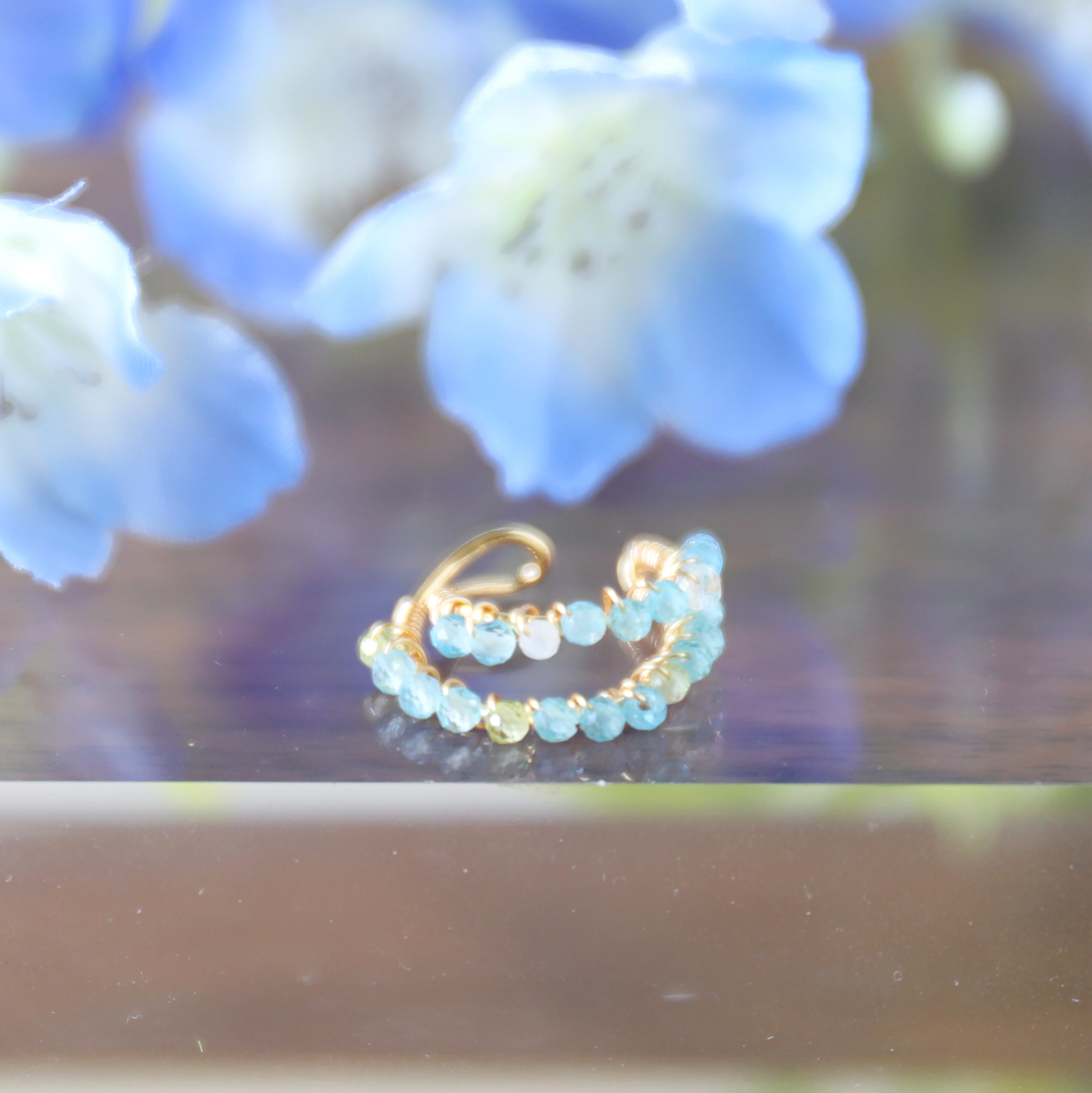【季節のお花と天然石のイヤカフ:ネモフィラ】ブルーアパタイト・クォーツ・ペリドット二連イヤーカフ(片耳用)#1301