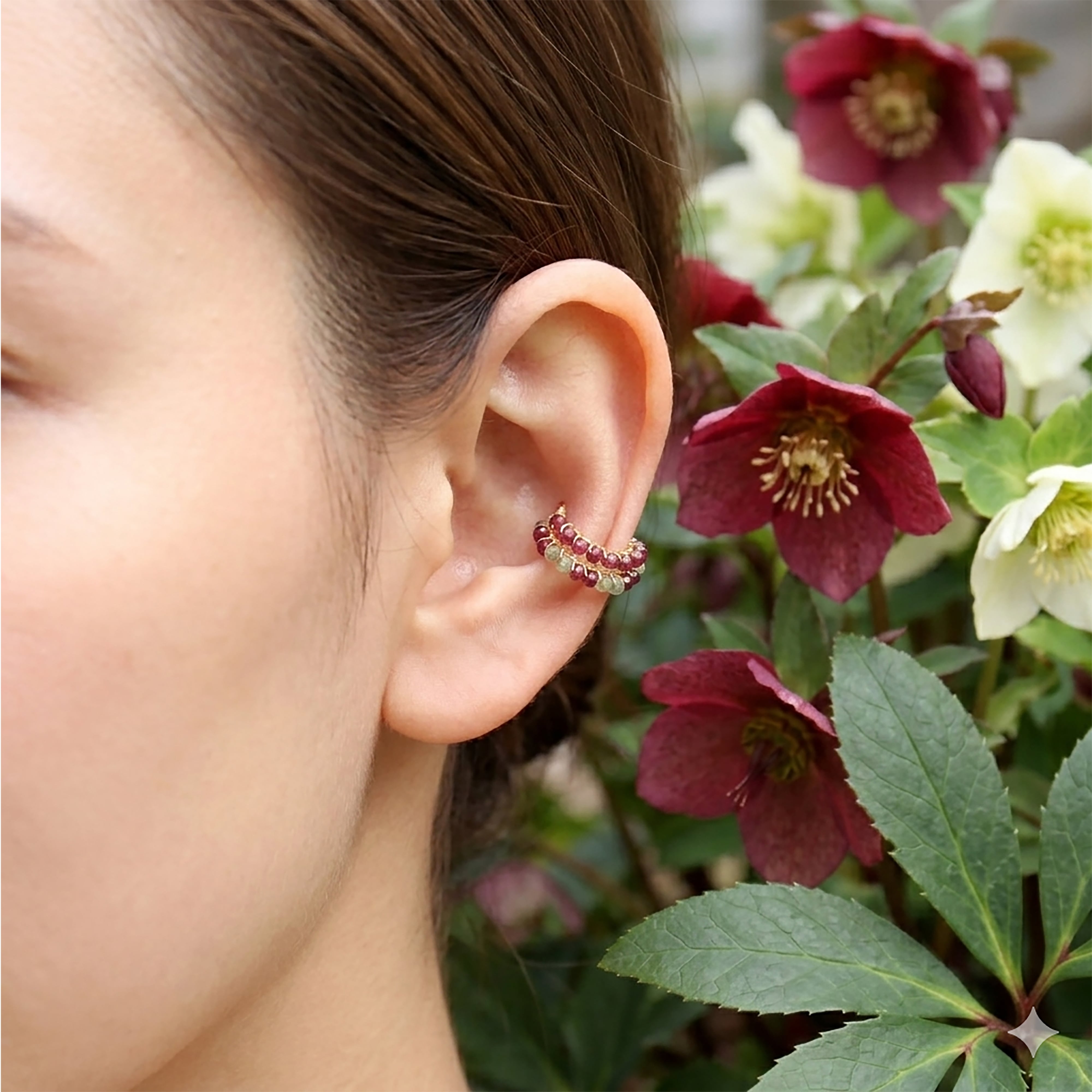 【季節のお花と天然石のイヤカフ:ヒマワリ】カルセドニー・カーネリアン・アパタイト二連イヤーカフ(片耳用) #1301