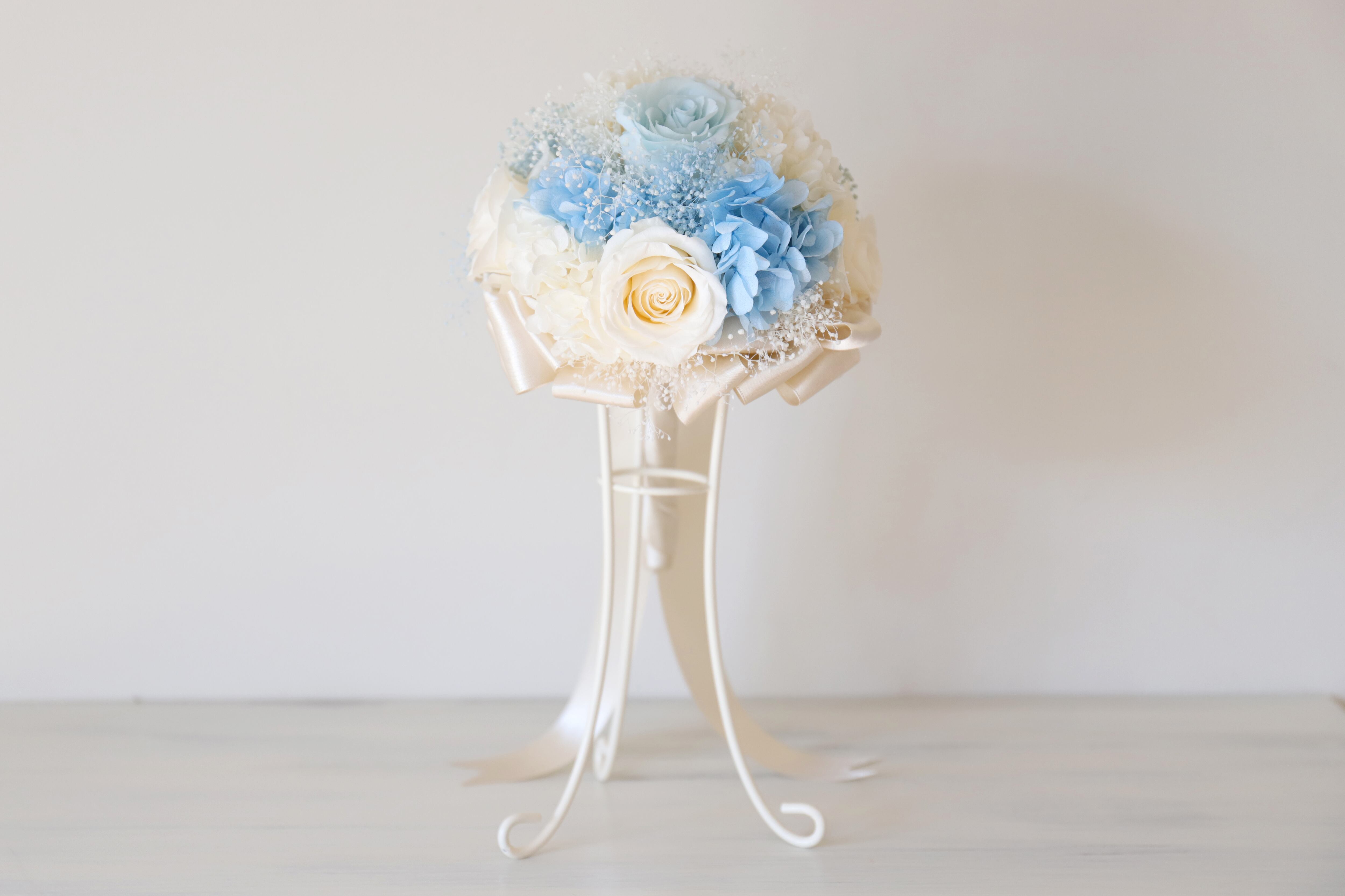 プリザーブド加工された、バラ、カスミソウ、アジサイをたくさん使って製作したラウンドブーケです。