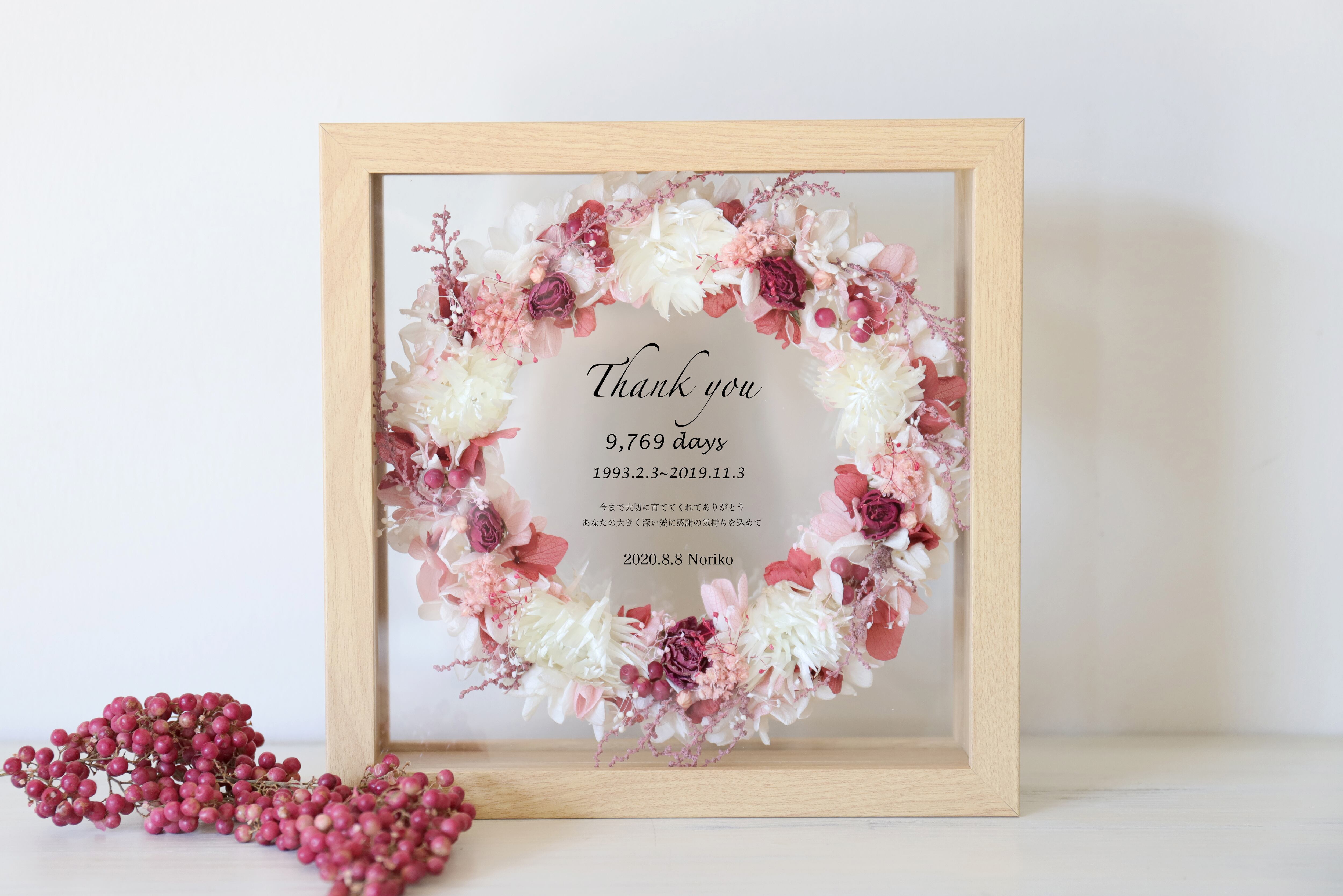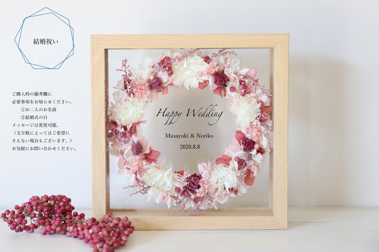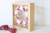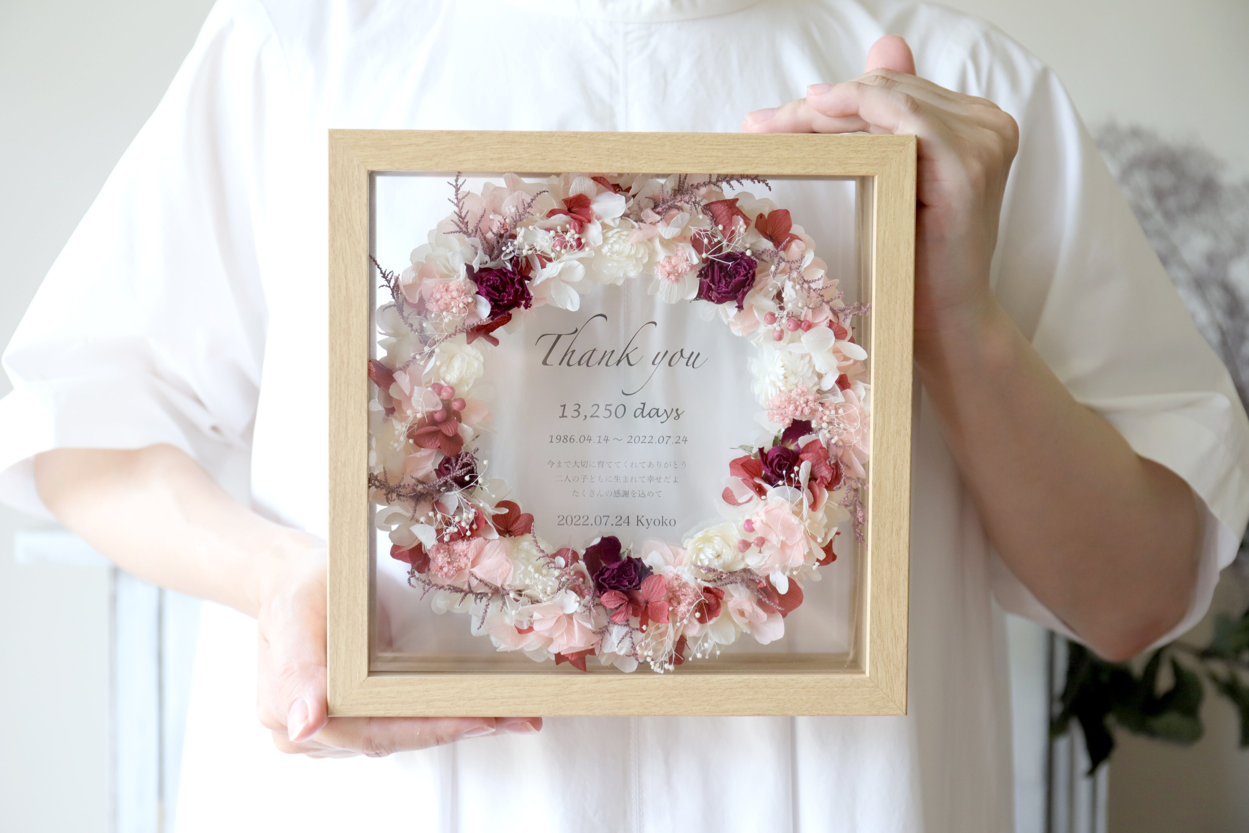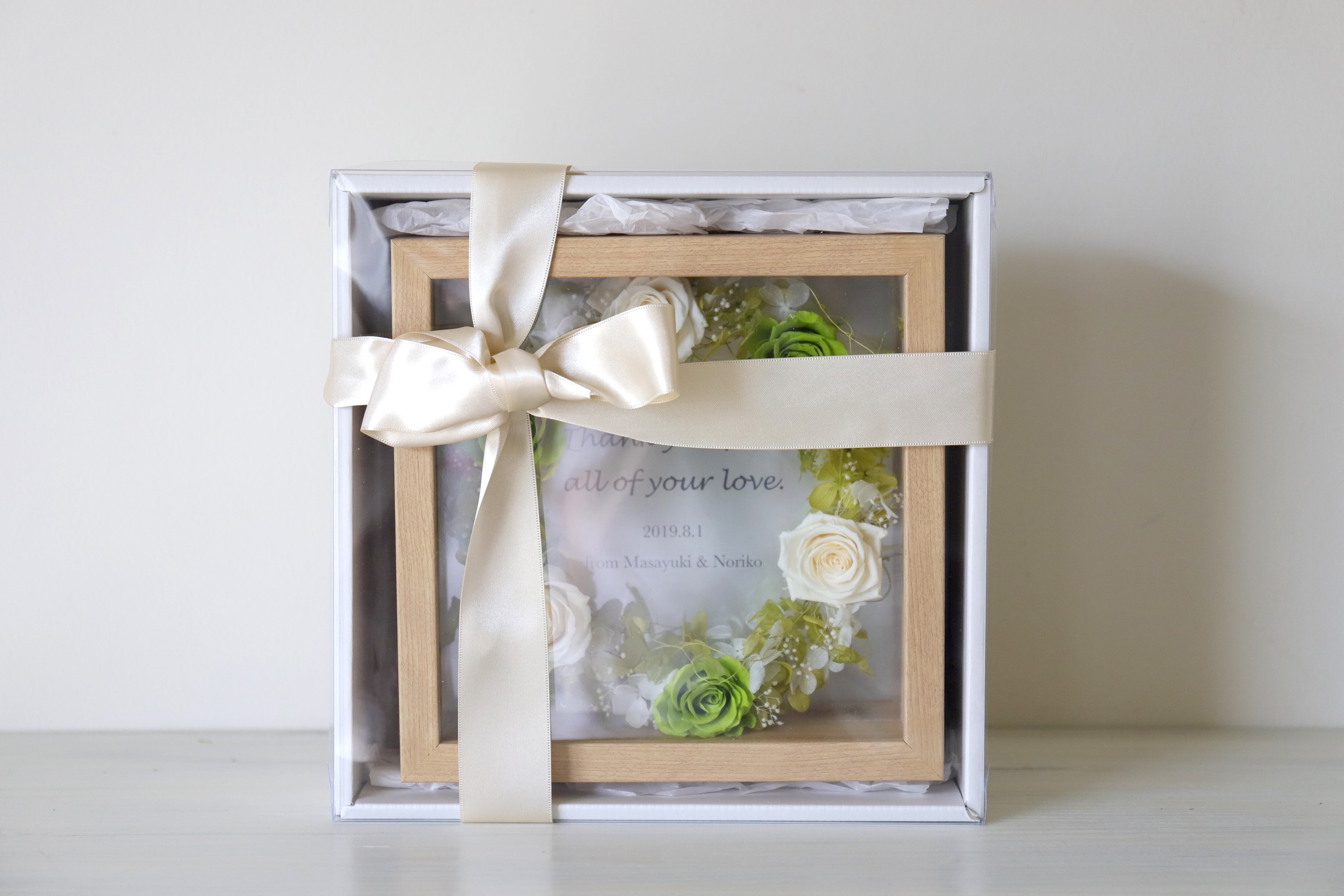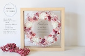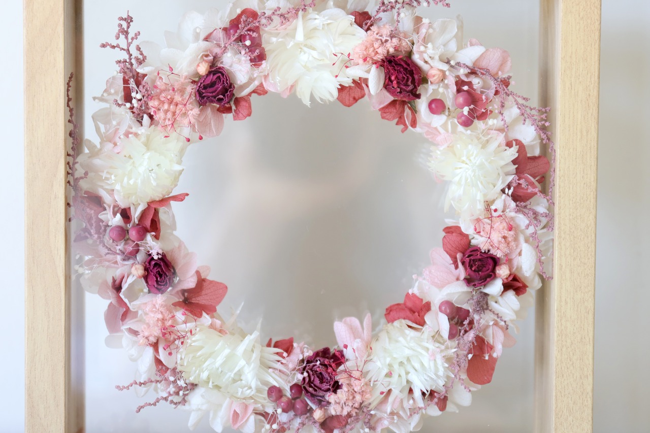 アジサイやローズなどをふんだんにあしらったリースをガラスフレームに閉じ込めた、可愛らしいアレンジメントです。