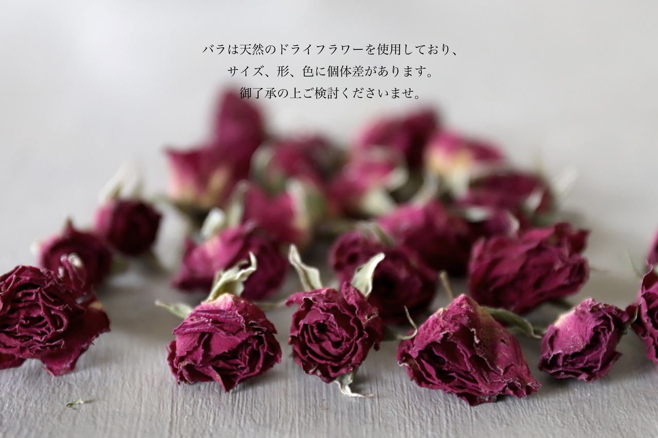 こちらで使用しているバラは天然のドライフラワーを使用しており、形、サイズ、色に個体差があります。