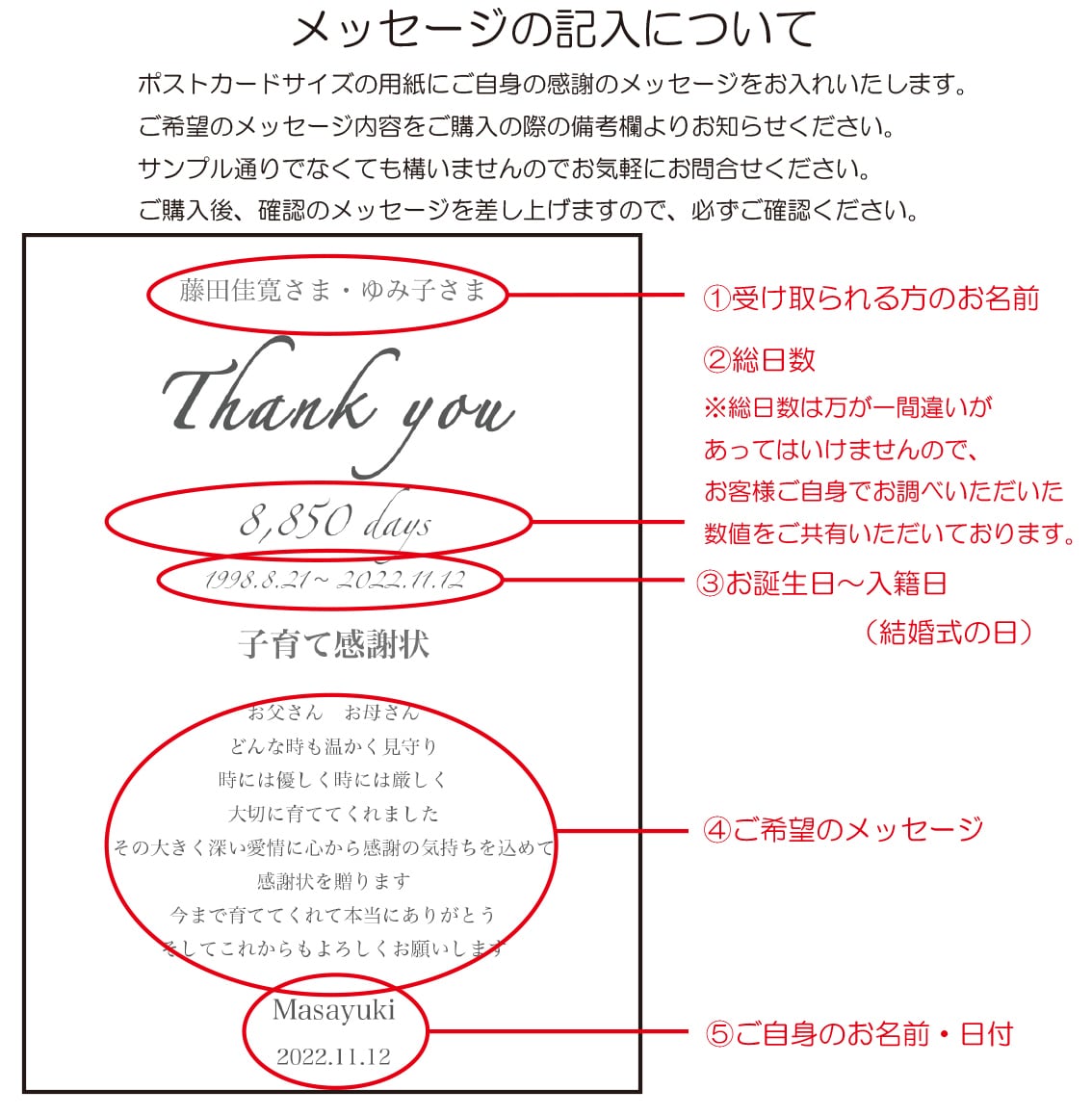 左側(お花側)の"Thank you"とお名前・日付の文字には