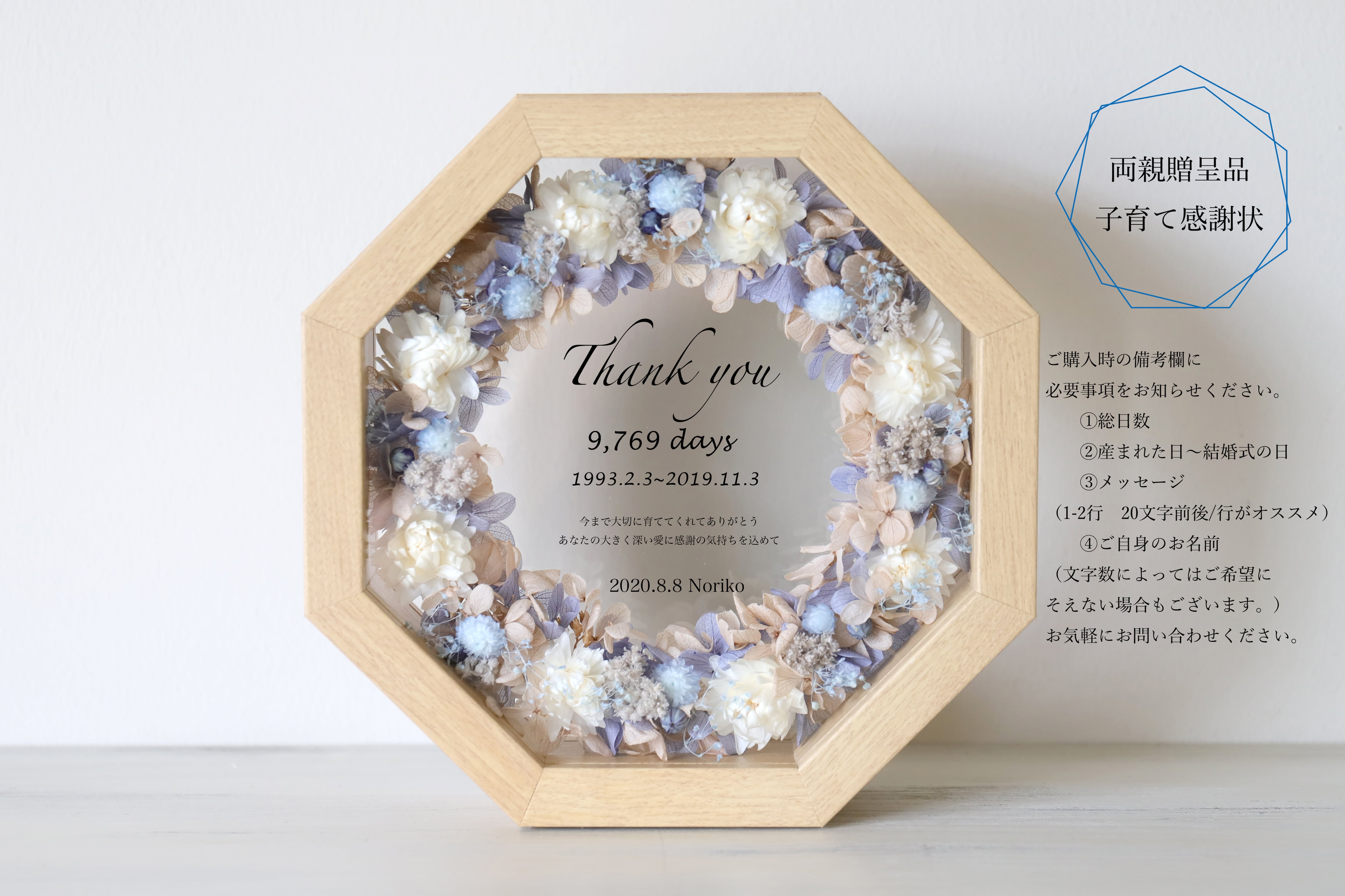 【母の日・両親贈呈品・結婚祝い・子育て感謝状・命名ボード】フラワーレターガラスフレーム(eight)ブルーシャンパン #936