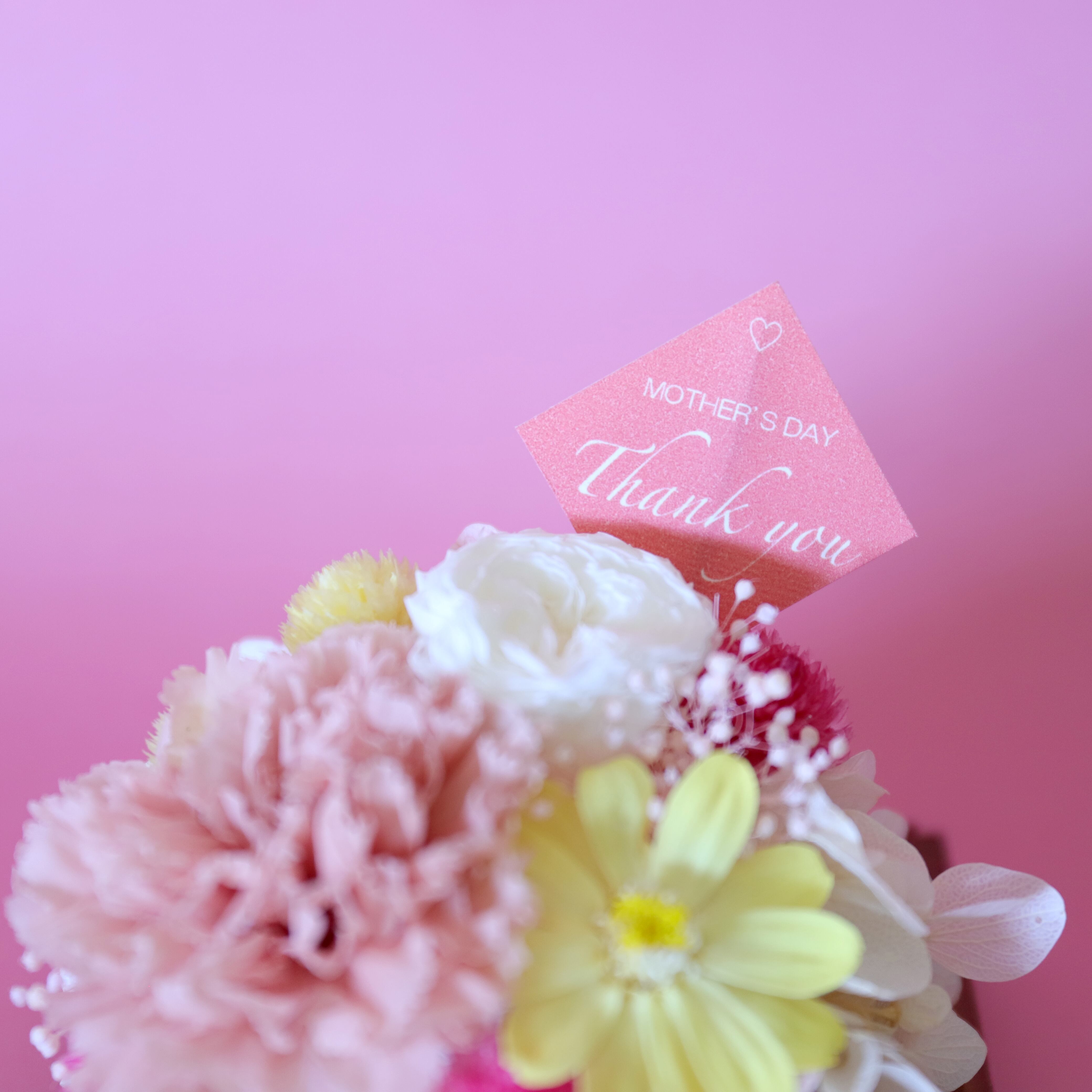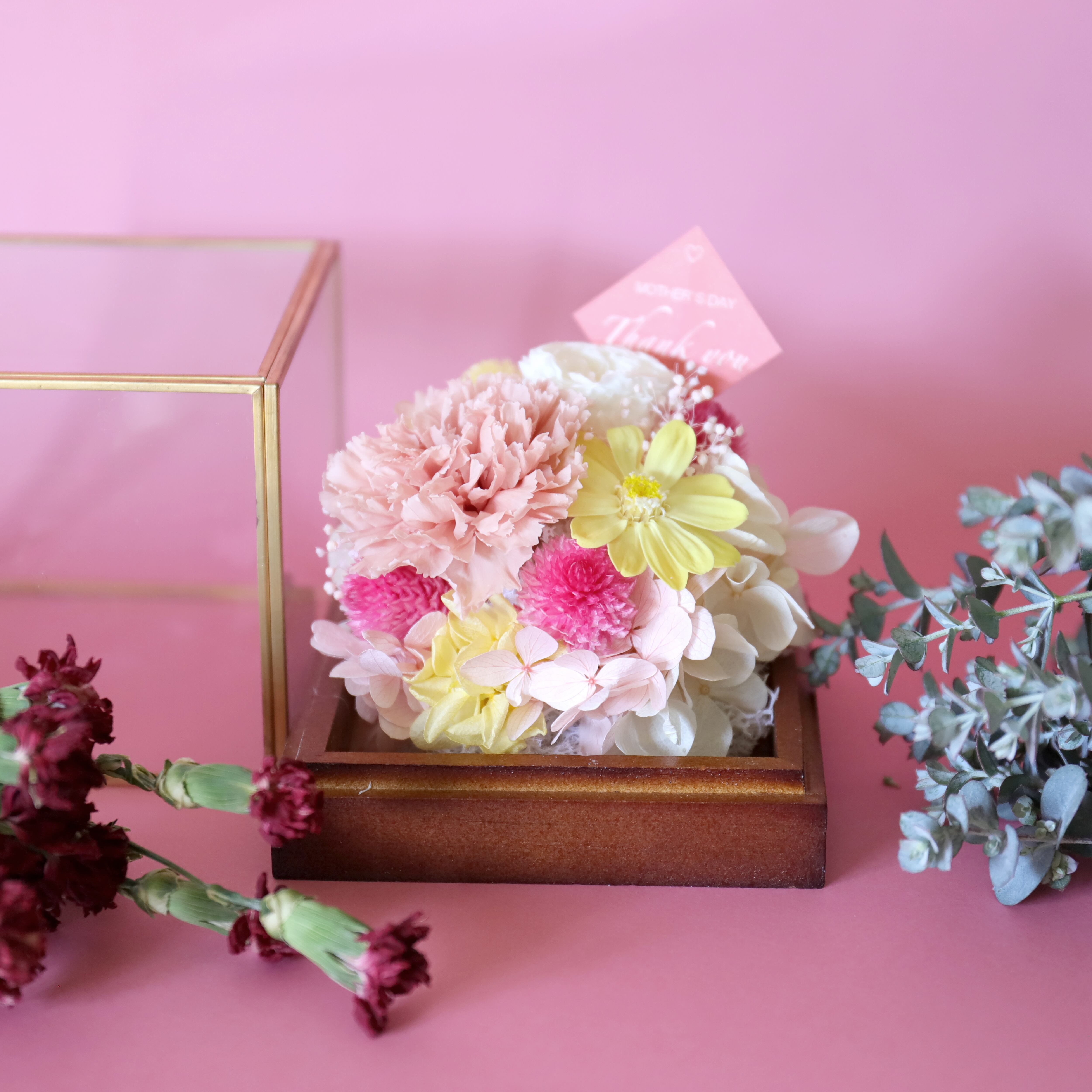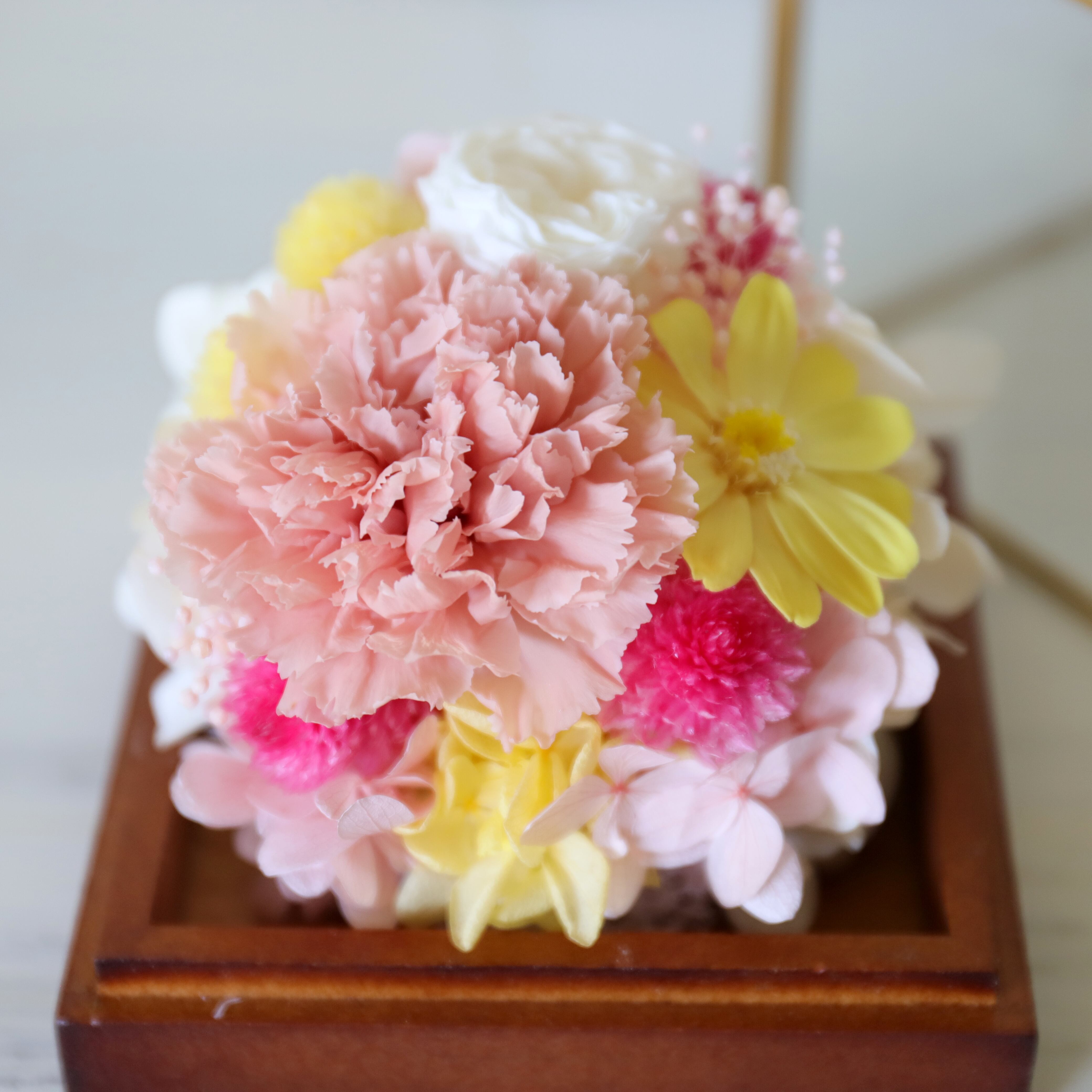 ピンクベージュの優しいプリザーブドカーネーションをメインに
